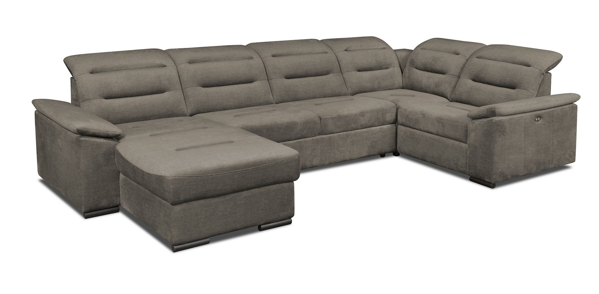 EXCLUSIV moderní modulová sedací souprava do U, rozkládací, pro příležitostné přespání, s úložným prostorem v OT. Výplň sedáků je tvořena kombinací pružin Faliste a PUR pěny, která zajistí pohodlné sezení. Opěrky vyplněny pěnou s vyšší elastičností. Má polohovatelné záhlavníky a černé ozdobné nožky. Pružinová matrace. Lze volit pravé či levé provedení. Sedací souprava se vyrábí ve velkém výběru potahových látek. K sedací soupravě lze dokoupit křeslo i taburet.