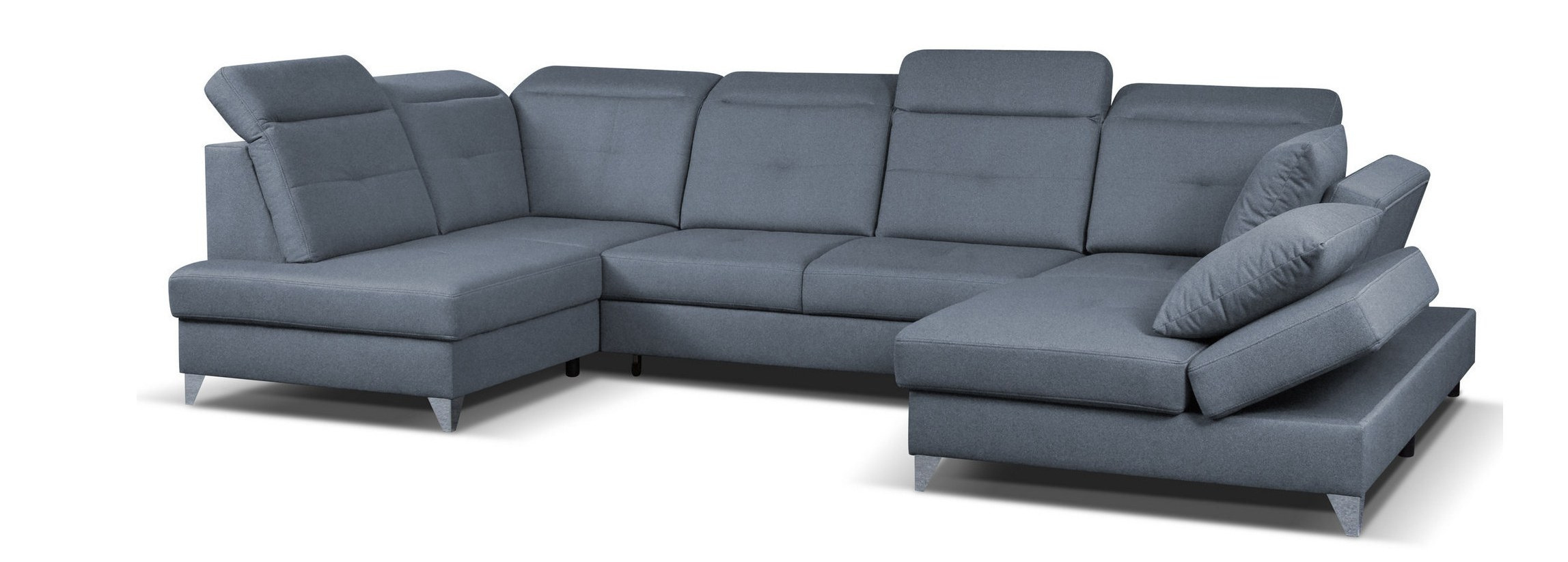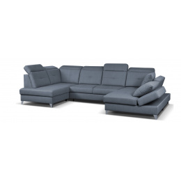 MONELI moderní rohová sedací souprava do U, rozkládací, pro příležitostné přespání, s úložným prostorem v OT. Výplň sedáků je tvořena kombinací pružin Faliste a PUR pěny, která zajistí pohodlné sezení. Opěrky vyplněny pěnou s vyšší elastičností. Má polohovatelné záhlavníky a chromované ozdobné nožky. Pružinová matrace. Lze volit pravé či levé provedení. Sedací souprava se vyrábí ve velkém výběru potahových látek.
