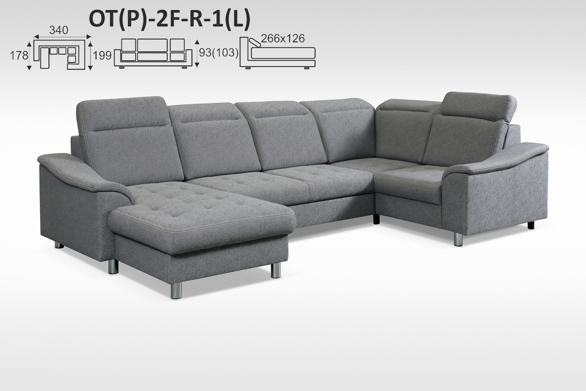 Celkový rozměry: 178 x 340 x 199 cm, v. 93-103 cm, po rozložení 266 x 126 cm