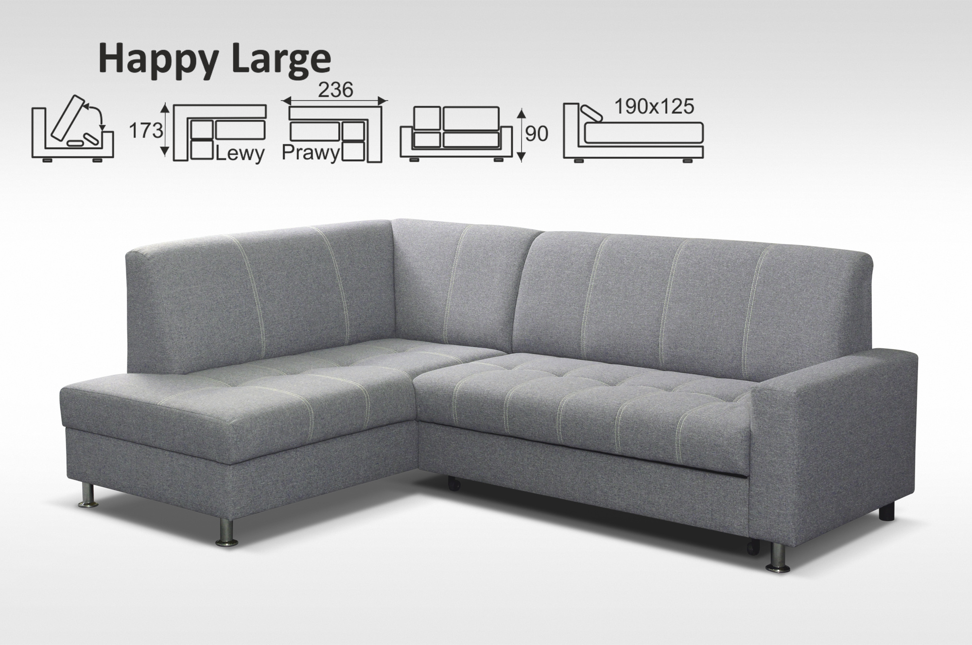 Celkový rozměry: 236 x 173 cm, v. 92 cm, po rozložení 190 x 125 cm, výška sedu - 46 cm