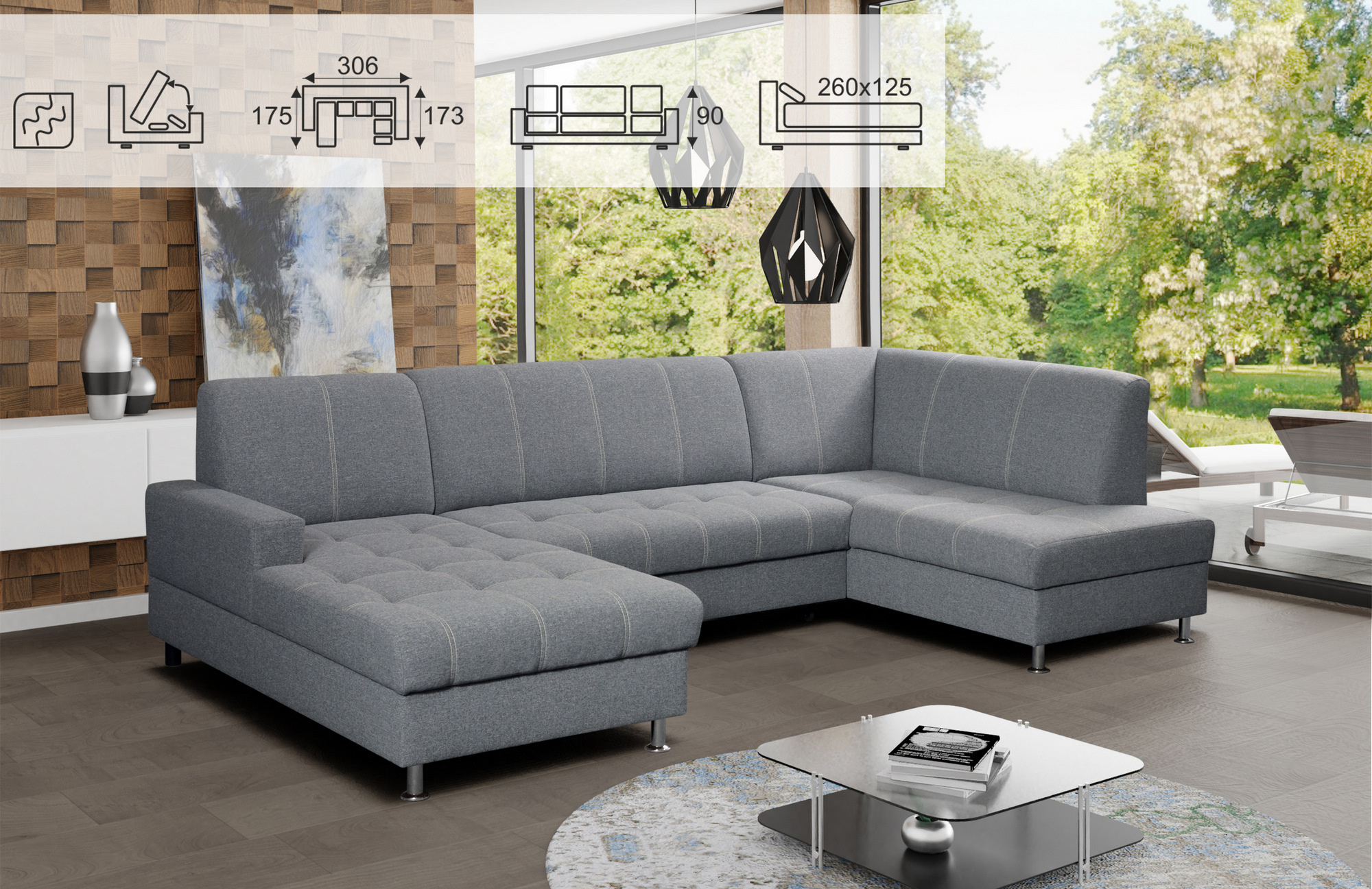 Celkový rozměry: 175 cm x 306 cm x 173 cm, v. 92 cm, po rozložení 260 x 125 cm, výška sedu - 46 cm