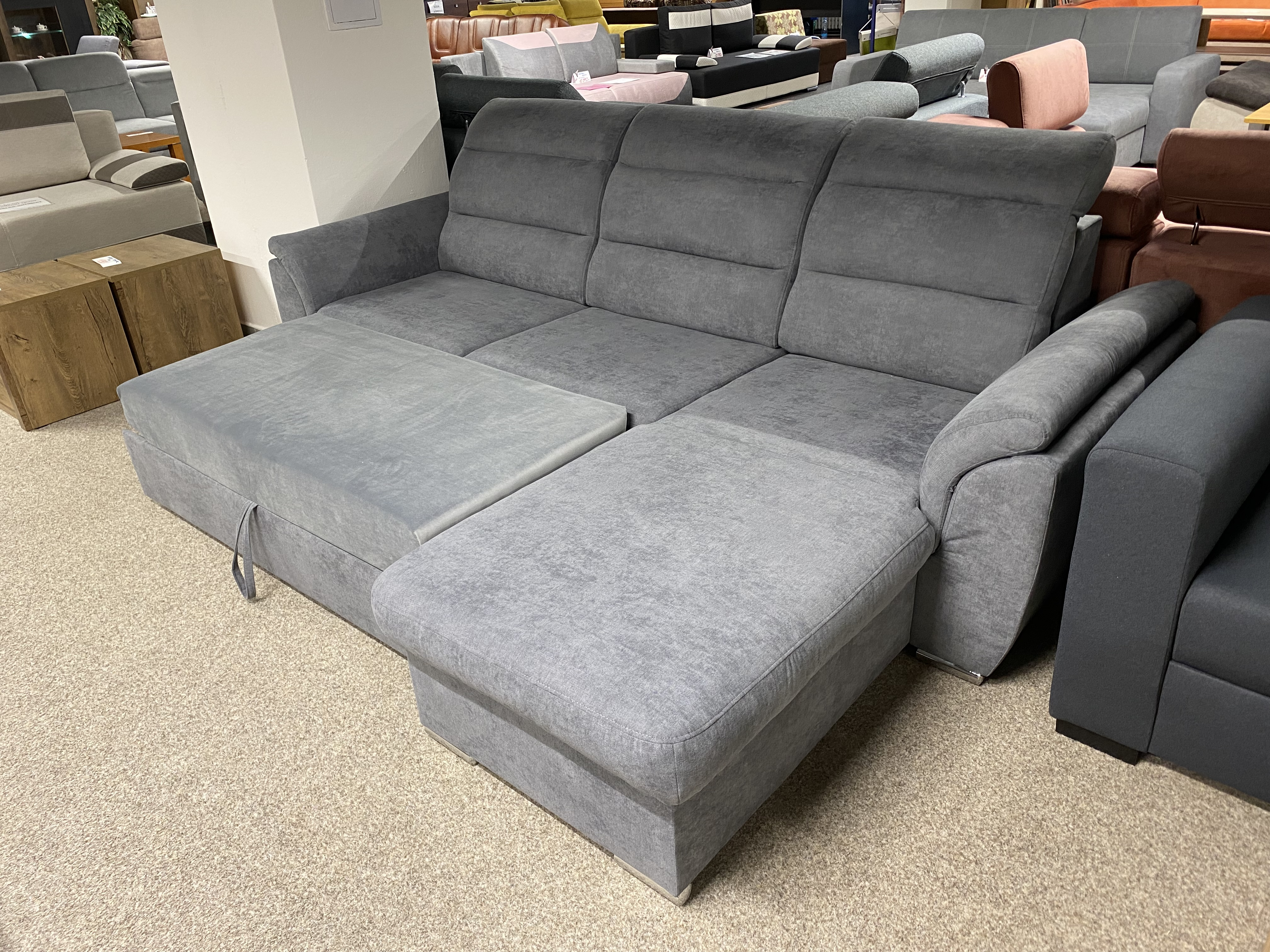 Luxusní rohová sedací souprava MILANO MINI PLUS s úložným prostorem, rozkládací. Moderní rohová rozkládací sedací souprava MILANO. Sedací souprava disponuje praktickým úložným prostorem. Soupravu dodáváme v levém nebo pravém provedení. Výškově nastavitelné záhlavníky. Výplň sedáků sedací soupravy tvoří kvalitní HR pěna. Moderní souprava je vyplněna pružinami Faliste. Pohodlná rozkládací sedací souprava je určena pro občasné spaní. Soupravu rozložíte vysunutím šuplíku.