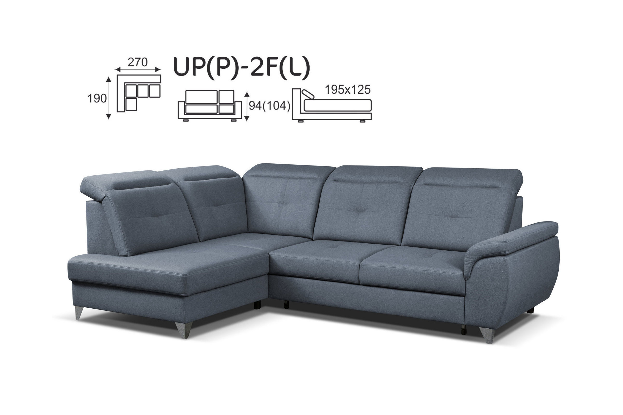 Celkový rozměry: 270 x 190 cm, v. 94-104 cm, po rozložení 195 x 125 cm