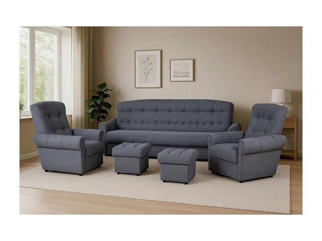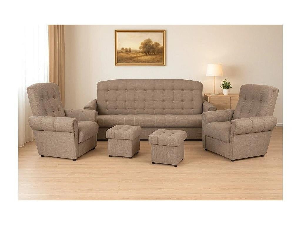 Klasická sedací souprava SWARZ v provedení 3R+1+1 + 2t. Čalouněná sedací souprava je vhodná do menších bytů, je složena z rozkládací pohovky, dvou křesel a dvou taburetů. Pohovka má úložný prostor a je rozkládací (rozklad klik/klak) k příležitostnému přespání. Sedáky jsou z PUR pěny, která zajistí pohodlné sezení a vyšší opěrky ocení starší lidé. Sedačku můžete jednoduše rozložit stylem klik/klak a poslouží k občasnému přespání. Po rozložení vznikne plocha na spaní 188 cm x 120 cm. Sedací souprava je očalouněna kvalitní potahovou látkou (kvalitní látka proti žmolkování , velmi příjemná na dotek , vysoká otěruvzdornost).