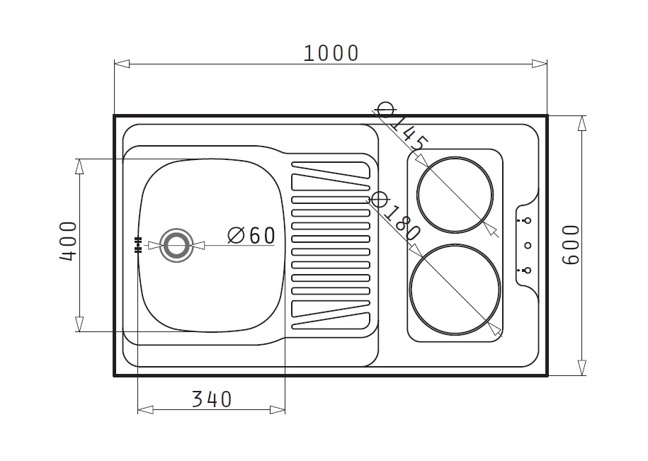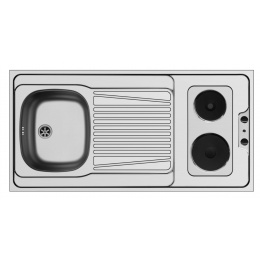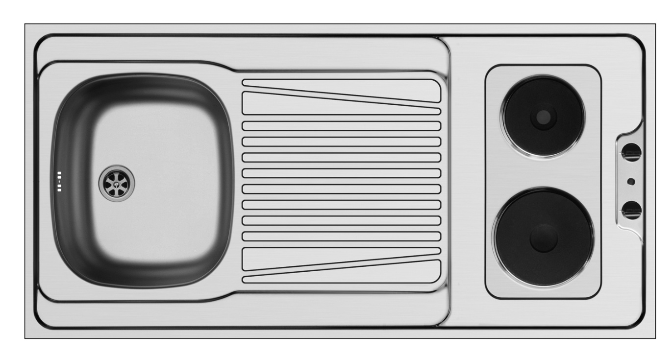 Nerezový kuchyňský dřez Pantry + dvouplotýnkový elektrický vařič. Ideální kombinace pro chaty, chalupy a malé kuchyně. Dřez v provedení hladký - satin s odtokovou hlavicí 60 mm. Tento dřez je vhodný pro skříňky od šířky 45 cm. Součástí dřezu je výtoková hlavice s bočním přepadem a sifon. Dřez lze použít ke všem kuchyňským linkám z naší nabídky a je univerzální na obě strany. V nerezové dřezové desce je vestavěný dvouplotýnkový vařič - menší plotýnka je rychlovarná, připojení silikonovým bezpečnostním kabelem, světelný indikátor zapnutí, ovládání dvěma knoflíky.