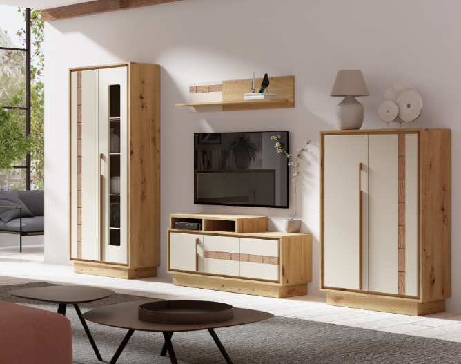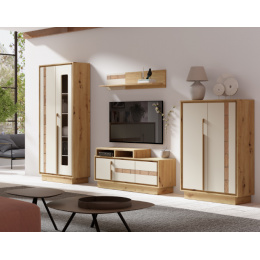 Sektor SETI je skvělá volba pro vytvoření moderního obývacího pokoje v atraktivním barevném provedení. Systém SETI se skládá z 10 jednotlivých prvků, které můžete mezi sebou vzájemně kombinovat a vytvořit tak ideální sestavu. Korpus nábytku je vyroben z kvalitního lamina v dekoru artisan, čelní plochy dvířek jsou z MDF v bílé barvě s výrazným dubovým dekorativním prvkem. Vitrína je doplněná LED osvětlením.