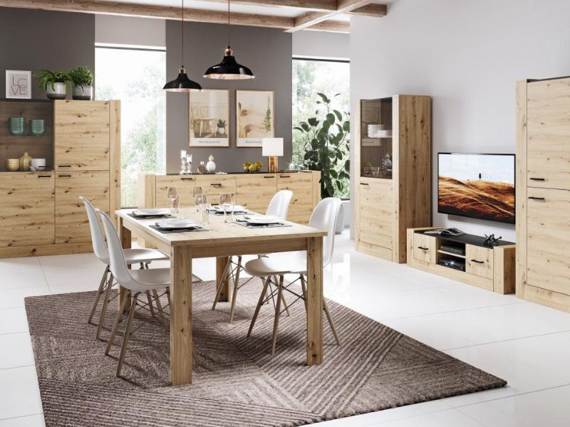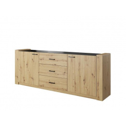 Kombinovaná komoda SEVA v moderním rustikálním designu, v barevné kombinaci dub artisan / černá. Komoda SEVA je trojdvířková s policemi a třemi šuplíky nad sebou. Komoda je vyrobená z kvalitního lamina. Horní odkládací deska je černá.