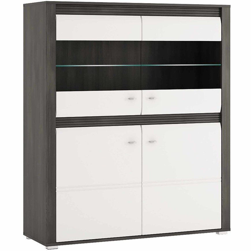 Komoda 33 - čtyřdveřová částečně prosklená s policemi, v prosklené části skleněná police ke které je možno dokoupit LED osvětlení