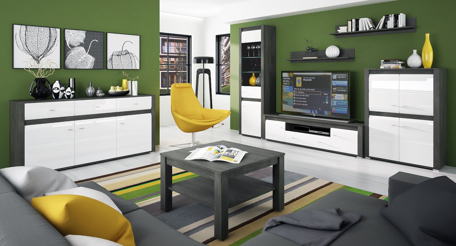 Moderní systémový nábytek SEVILLA. Nábytek se skvěle hodí do obývacího pokoje i jídelny. Elegantně působící kombinace barev norské černé borovice v kombinaci s dvířky v bílém vysokém lesku, doplněná chromovanými kovovými úchyty. Nábytek je vyroben z kvalitního lamina - korpusy a MDF - dvířka a čela šuplíků.