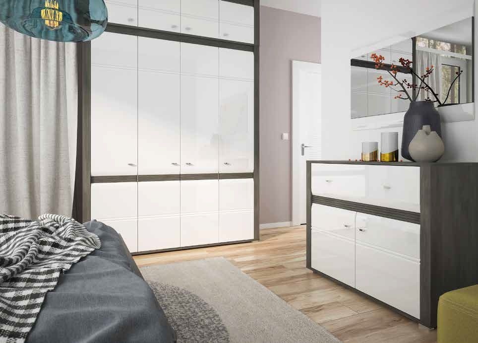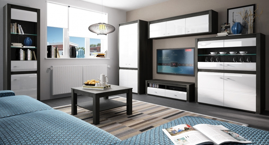 Moderní systémový nábytek SEVILLA. Nábytek se skvěle hodí do obývacího pokoje i jídelny. Elegantně působící kombinace barev norské černé borovice v kombinaci s dvířky v bílém vysokém lesku, doplněná chromovanými kovovými úchyty. Nábytek je vyroben z kvalitního lamina - korpusy a MDF - dvířka a čela šuplíků.