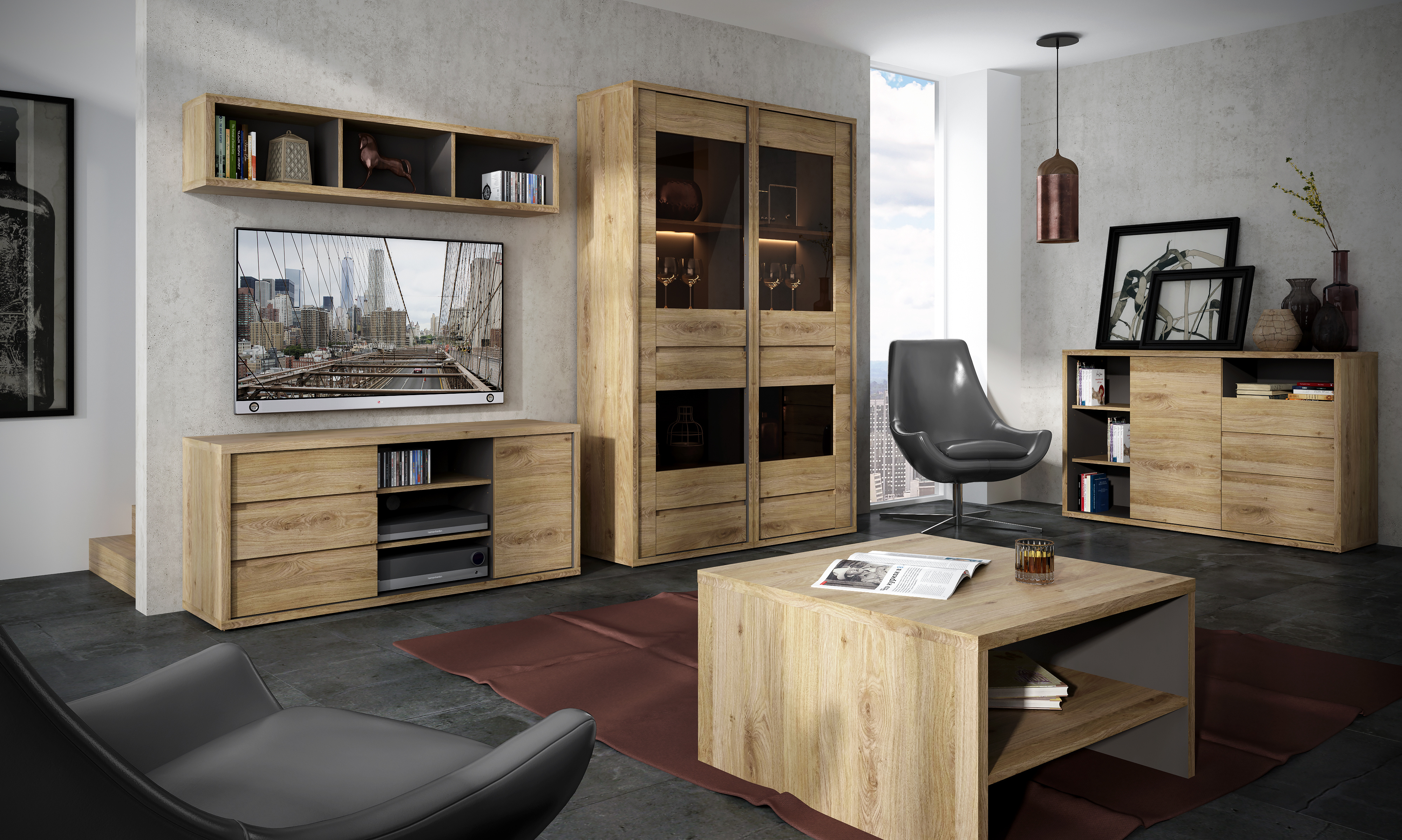 Systém SHETLAND, jednoduchý, funkční v atraktivním barevném provedení. Umožní Vám sestavit obývací pokoj s jídelnou a studentský pokoj. Jednotlivé prvky sektoru SHETLAND můžete libovolně kombinovat. Nábytek je vyrobený z kvalitního lamina v dekoru Dub Shetland / šedá. Je odolný proti poškrábání, vlhkosti a vysokým teplotám.