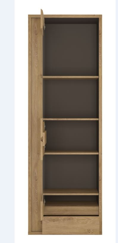 Vitrína SHETLAND 01, kombinovaná vitrína s jedním šuplíkem a policemi. Možnost doobjednání LED osvětlení. Dvířka lze namontovat s otvíráním doleva nebo doprava.