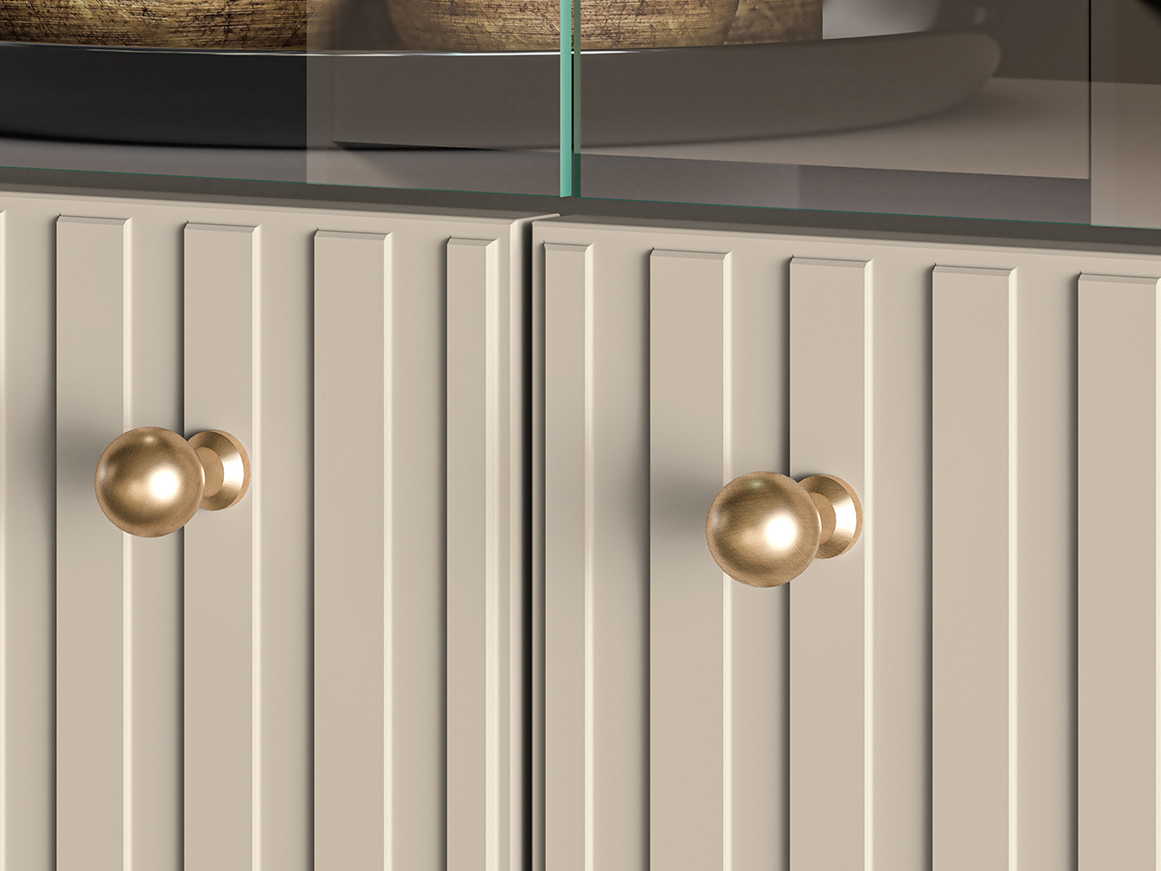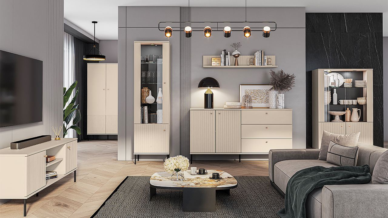 Moderní, minimalistický nábytek s elegantně řešenými detaily. Systémovým nábytkem SOPHIE zařídíte obývací pokoj v nadčasové dekoru Cashmere se zlatými úchyty. Nábytek je vyroben z kvalitního lamina ( korpus ) a MDF ( dvířka a čela šuplíků ) a je postaven na vysoké nožičky. Tiché dovírání dvířek, plný výsuv u šuplíků a vnitřní osvětlení vitrín v základní výbavě, dál zvyšují standart sektoru SOPHIE. Zajímavým dekorativním prvkem jsou svislé prolisy čelních ploch na dvířkách a šuplících.