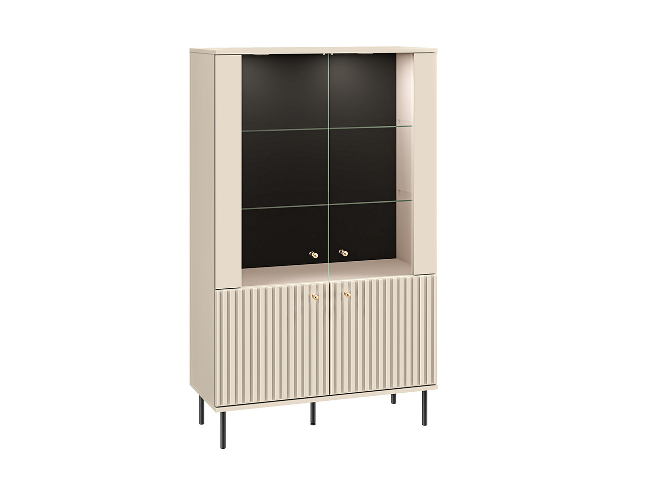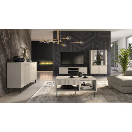 Moderní, minimalistický nábytek s elegantně řešenými detaily. Systémovým nábytkem SOPHIE zařídíte obývací pokoj v nadčasové dekoru Cashmere se zlatými úchyty. Nábytek je vyroben z kvalitního lamina ( korpus ) a MDF ( dvířka a čela šuplíků ) a je postaven na vysoké nožičky. Tiché dovírání dvířek, plný výsuv u šuplíků a vnitřní osvětlení vitrín v základní výbavě, dál zvyšují standart sektoru SOPHIE. Zajímavým dekorativním prvkem jsou svislé prolisy čelních ploch na dvířkách a šuplících.