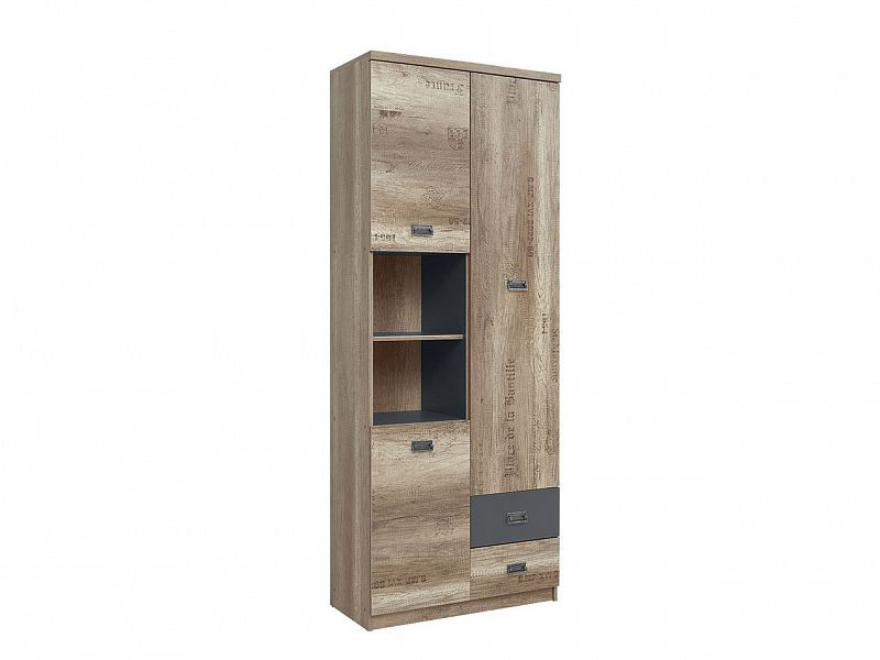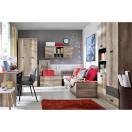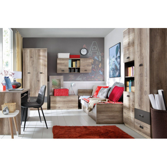 Kolekce nábytku Malcolm se opírá o nejnovější trendy v zařizování pokojů pro děti a studenty. Vyznačuje se moderním provedením dvířek a korpusů s výraznými grafickými akcenty, v barevném provedení: Dub canyon monument s 3D potiskem. Barva dřeva dub canyon monument vytváří zajímavý kontrast s moderní barvou - šedý wolfram. Na zajímavém pozadí krásně vyniknou praktické, kovové úchyty v barvě starého zlata.