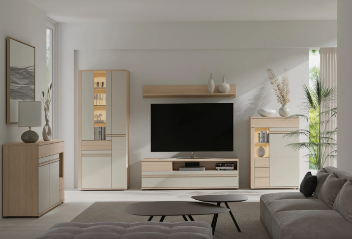 Systémový nábytek SVEN je skvělá volba pro vytvoření moderního obývacího pokoje v atraktivním barevném provedení. Sektor DENIS se skládá z 6 jednotlivých prvků, které můžete mezi sebou vzájemně kombinovat a vytvořit tak ideální nábytkovou sestavu. Korpus nábytku je vyroben z kvalitního lamina v dekoru riva, čelní plochy dvířek a šuplíků jsou z MDF v dekoru caschmere s dekorativními lištami. Vitrína je doplněna LED osvětlením. Skříňky jsou vybaveny systémem tichého dovírání.