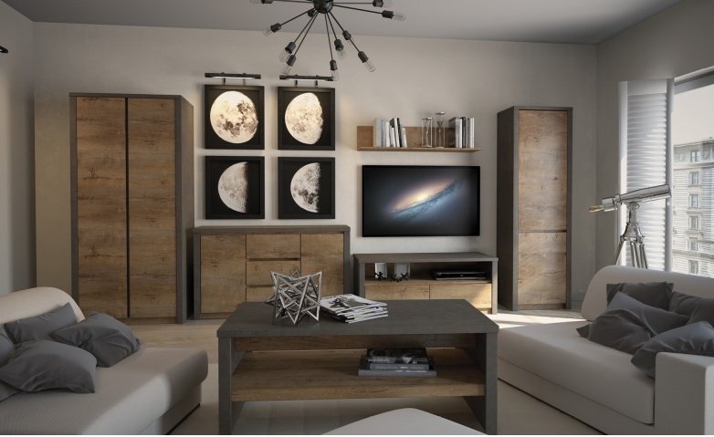 Elegantní nábytkový systém MONTANA má množství segmentů, ze kterých si sami můžete sestavit obývací pokoj, ložnici nebo jídelnu. Sektor MONTANA je vyroben z kvalitní MDF s přiznanou strukturou dřeva, ve dvou barevných dekorech - dub lefkas a dub lefkas ( čelní plochy ) / šedá  ( korpus ). Dvířka mají bezúchytové otevíraní.