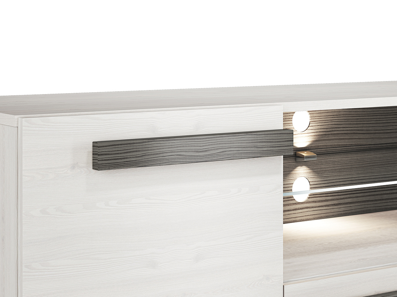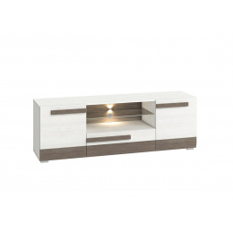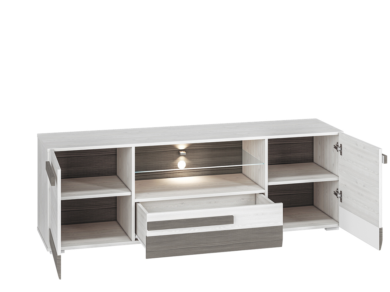 Televizní stolek BLANCO 09, kombinovaný dvoudvéřový televizní stolek se šuplíkem. Možno doobjednat LED osvětlení skleněné police.
