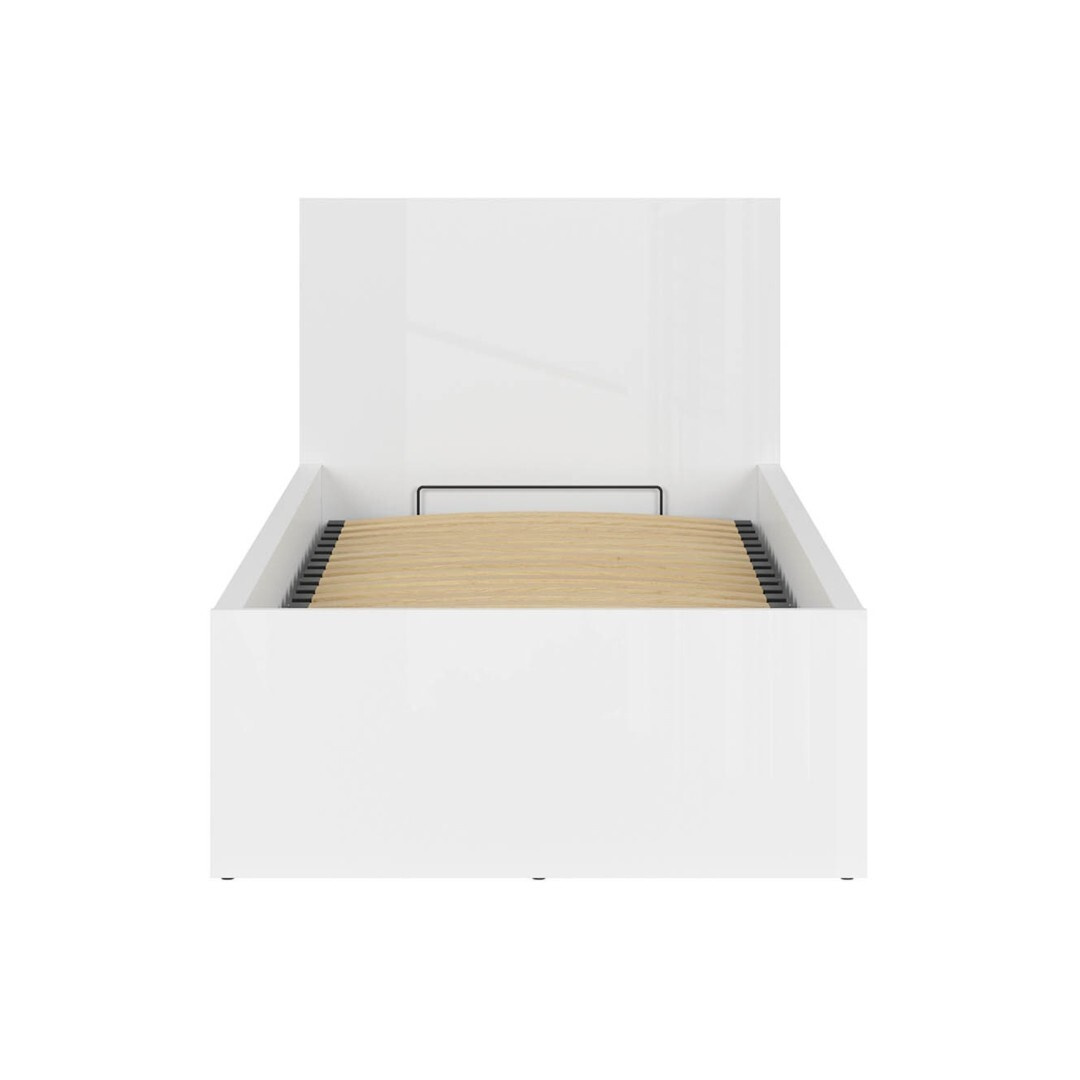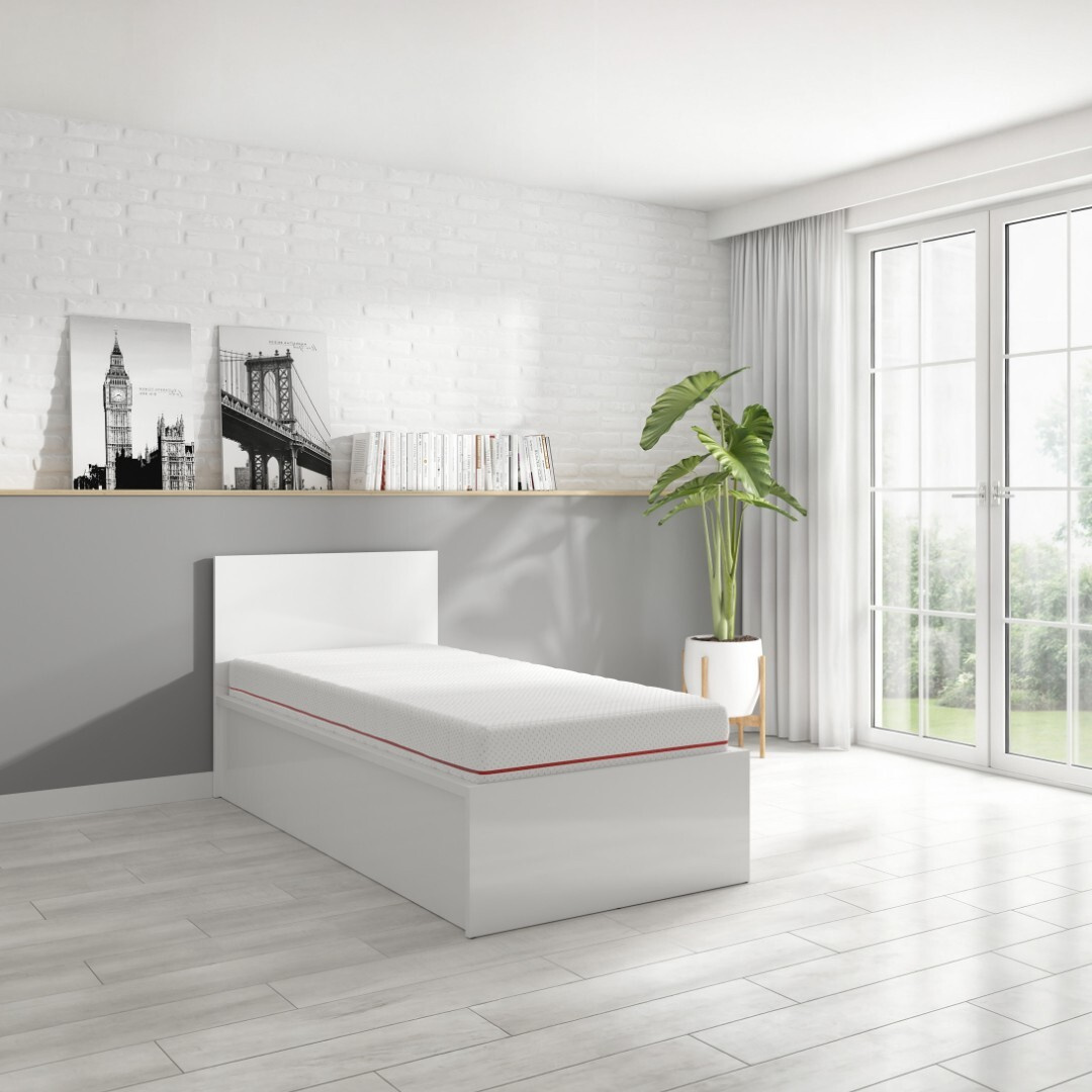 Postel 90 x 200 cm ze systému TETRIX - s úložným prostorem přístupným po zvednutí lamelového roštu, který je součástí postele. Úložný prostor je rozdělen na dva boxy. Využitelná výška je 26 cm. Bočnice postele jsou vyrobeny z kvalitního lamina o síle 18 mm. Horní hrana bočnic je opticky zesílena. Čelo je vyrobeno z lamino o síle 22 mm. Barevné provedení bílá, s mírným leskem. Výška rámu postele je 40 cm. Čelo postele můžete doplnit čalouněním v šedém, černém nebo béžovém barevném provedení. Rozměr lehací plochy - matrace 90 x 200 cm.