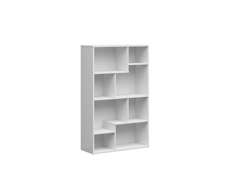 Regál REG/140/90 ze systému TETRIX - otevřený s policemi, vyrábí se z kvalitního lamina o síle 1,9 a 1,6 cm v bílém barevném provedení, můžete po složení postavit na výšku nebo na šířku, max. zatížení jednotlivých polic je 5 kg.