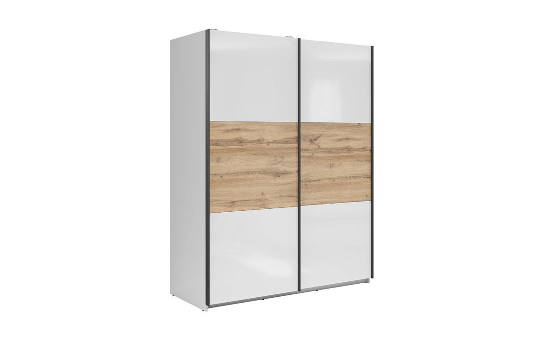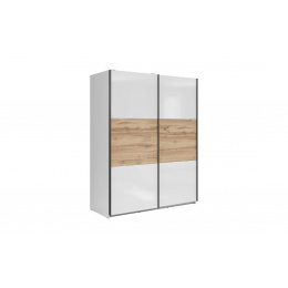 Šatní skříň SZF/153 ze systému TETRIX - kombinovaná s posuvnými dveřmi, vnitřní prostor ve skříni je rozdělen pomocí polic a dvou šatních tyčí, vyrábí se z kvalitního lamina v barevném provedení bílá lesk / dub votan.