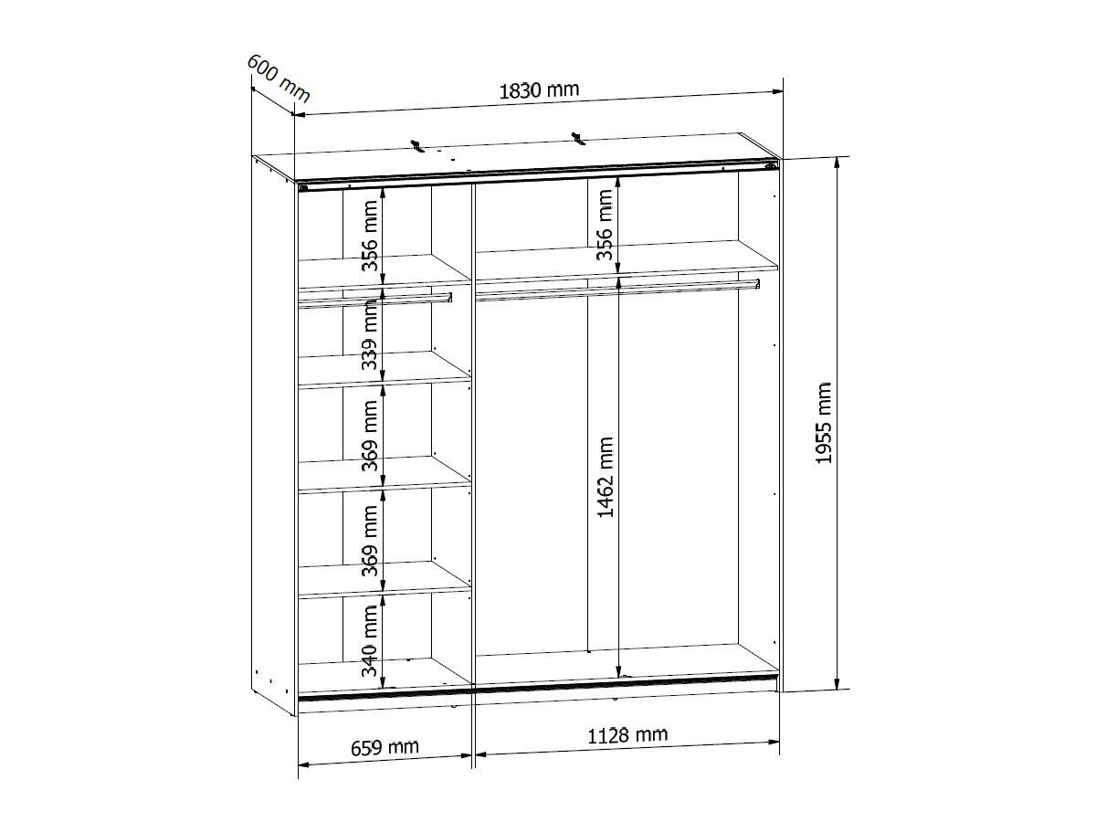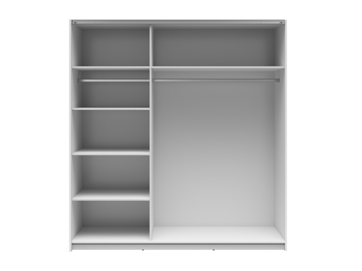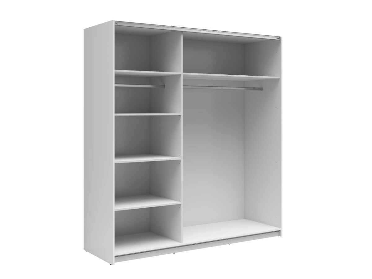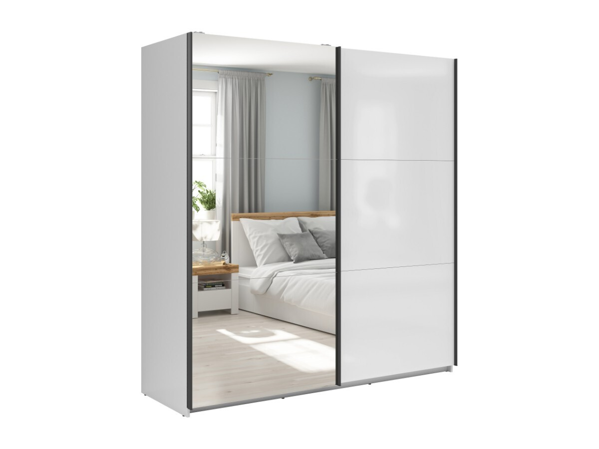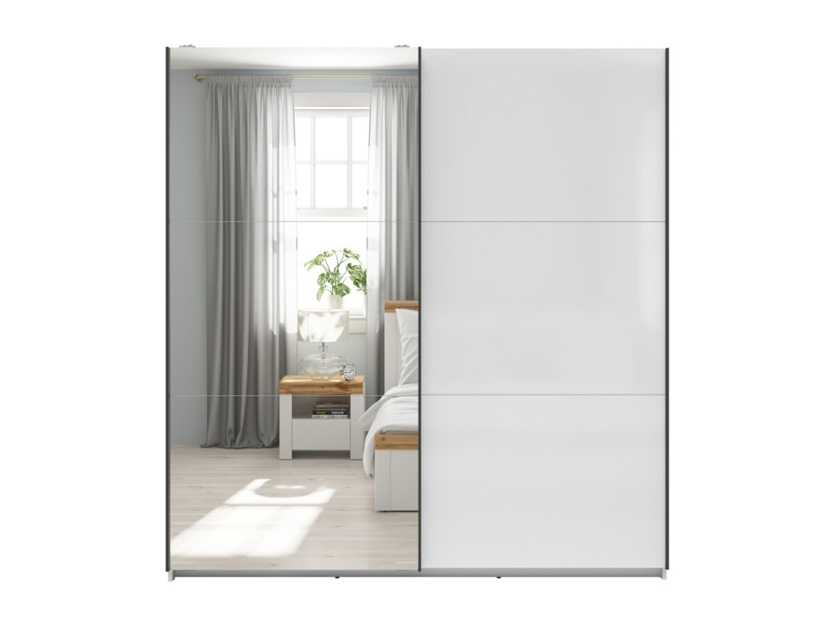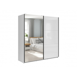 Šatní skříň SZF/183/M ze systému TETRIX - kombinovaná s posuvnými dveřmi a se zrcadlem, vnitřní prostor ve skříni je rozdělen pomocí polic a dvou šatních tyčí, vyrábí se z kvalitního lamina v barevném provedení bílá lesk.