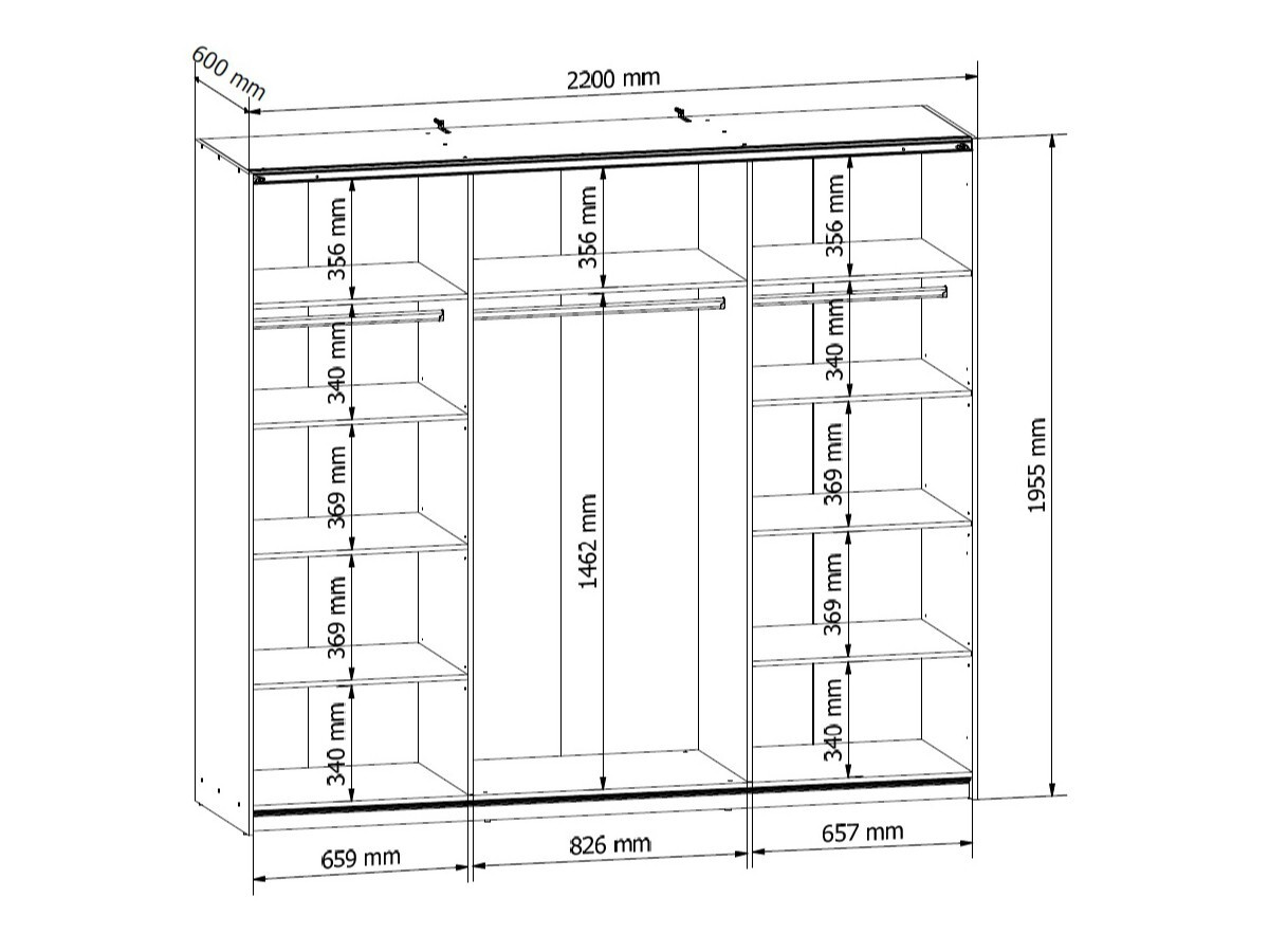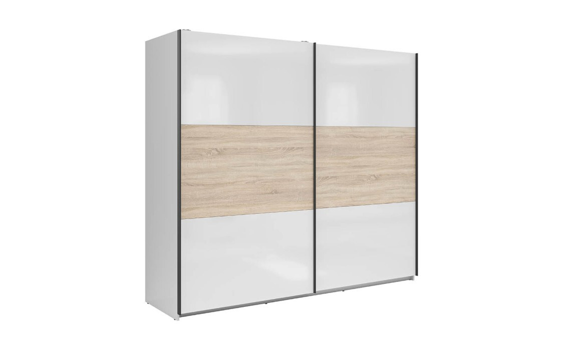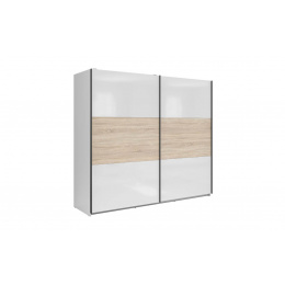 Šatní skříň SZF/220 dub sonoma ze systému TETRIX - kombinovaná s posuvnými dveřmi, vnitřní prostor ve skříni je rozdělen pomocí polic a tří šatních tyčí, vyrábí se z kvalitního lamina v barevném provedení bílá lesk / dub sonoma