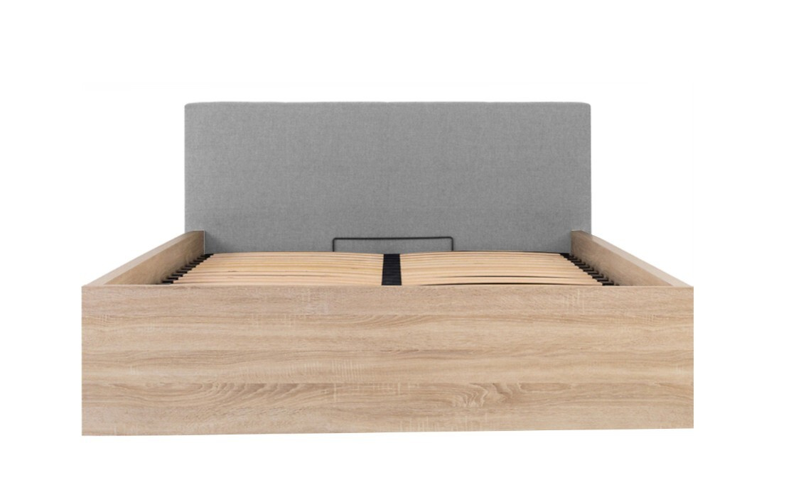 Postel 160 x 200 cm ze systému TETRIX - s úložným prostorem přístupným po zvednutí lamelového roštu, který je součástí postele. Úložný prostor je rozdělen na dva boxy. Využitelná výška je 26 cm. Bočnice postele jsou vyrobeny z kvalitního lamina o síle 18 mm. Horní hrana bočnic je opticky zesílena. Čelo je vyrobeno z lamino o síle 22 mm. Barevné provedení dub sonoma. Čelo je očalouněno potahovou látkou Inari 91. Výška rámu postele je 40 cm. Rozměr lehací plochy - matrace 160 x 200 cm.