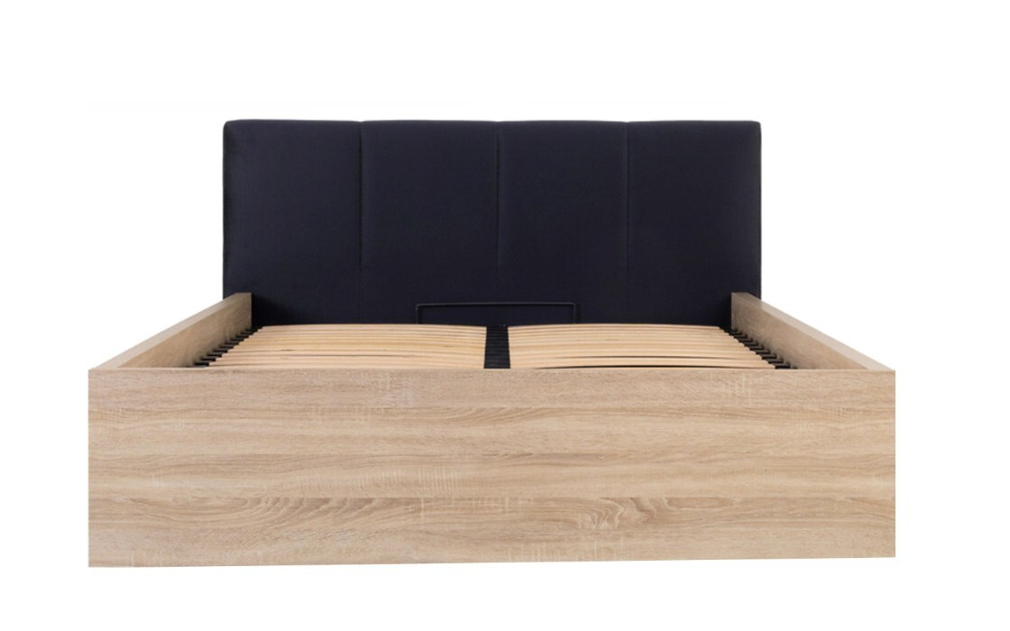 Postel 160 x 200 cm ze systému TETRIX - s úložným prostorem přístupným po zvednutí lamelového roštu, který je součástí postele. Úložný prostor je rozdělen na dva boxy. Využitelná výška je 26 cm. Bočnice postele jsou vyrobeny z kvalitního lamina o síle 18 mm. Horní hrana bočnic je opticky zesílena. Čelo je vyrobeno z lamino o síle 22 mm. Barevné provedení dub sonoma. Čelo je očalouněno potahovou látkou SOLAR 99. Výška rámu postele je 40 cm. Rozměr lehací plochy - matrace 160 x 200 cm.
