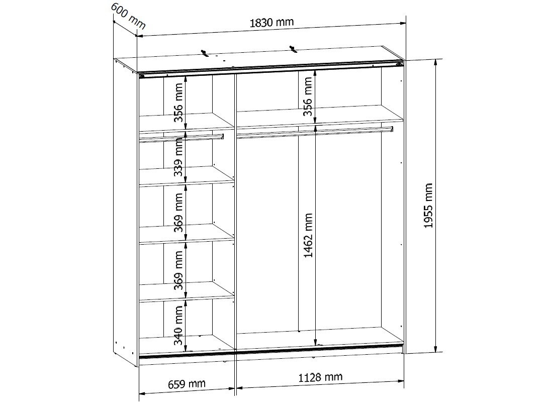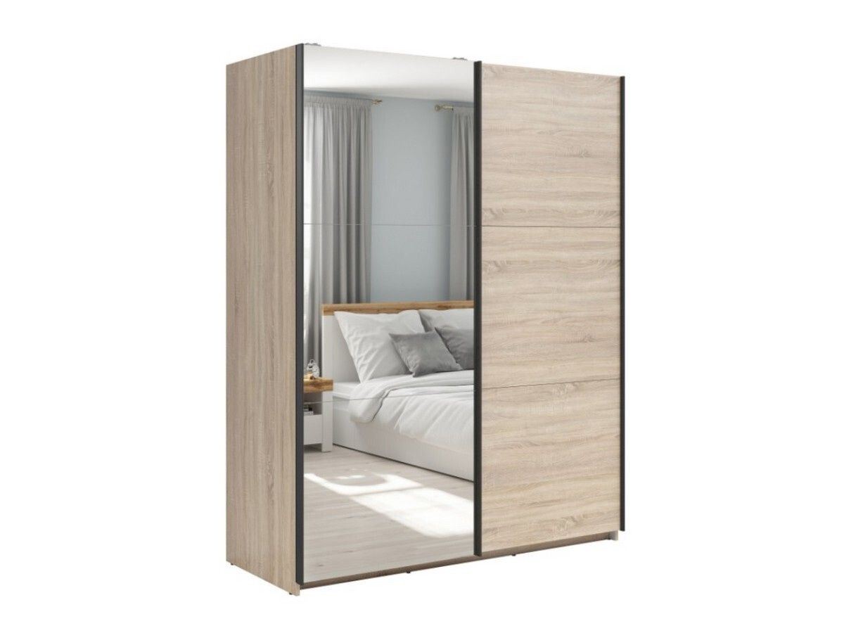 Šatní skříň SZF/183/M ze systému TETRIX - kombinovaná s posuvnými dveřmi a se zrcadlem, vnitřní prostor ve skříni je rozdělen pomocí polic a dvou šatních tyčí, vyrábí se z kvalitního lamina v barevném provedení dub sonoma.
