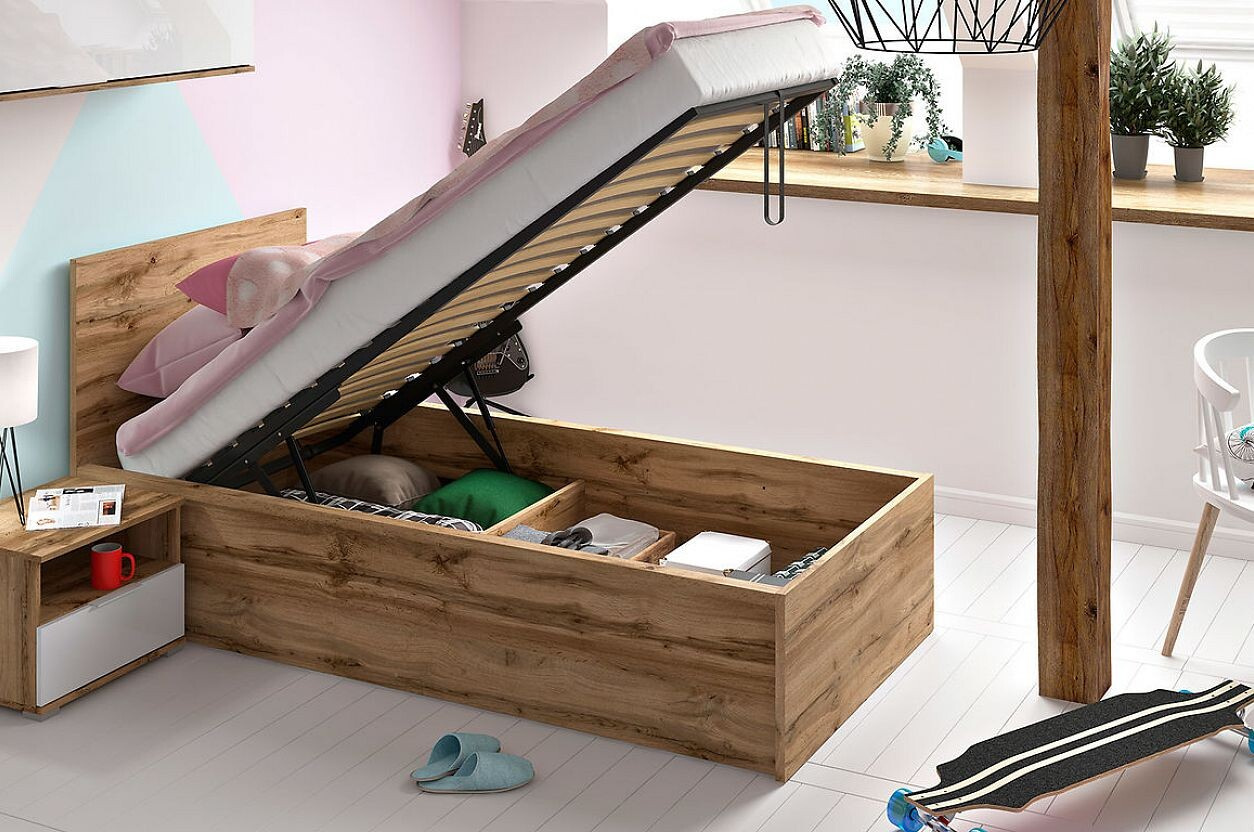 Postel 160 x 200 cm ze systému TETRIX - s úložným prostorem přístupným po zvednutí lamelového roštu, který je součástí postele. Úložný prostor je rozdělen na dva boxy. Využitelná výška je 26 cm. Bočnice postele jsou vyrobeny z kvalitního lamina o síle 18 mm. Horní hrana bočnic je opticky zesílena. Čelo je vyrobeno z lamino o síle 22 mm. Barevné provedení dub votan. Čelo je očalouněno potahovou látkou MODONE 9702. Výška rámu postele je 40 cm. Rozměr lehací plochy - matrace 160 x 200 cm.