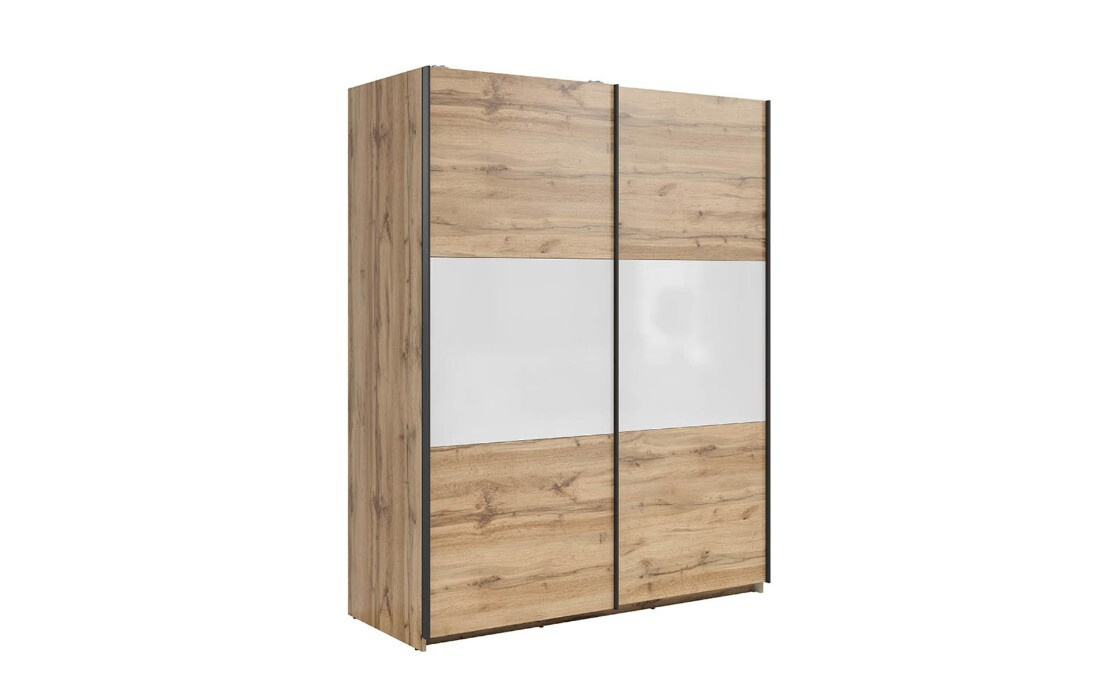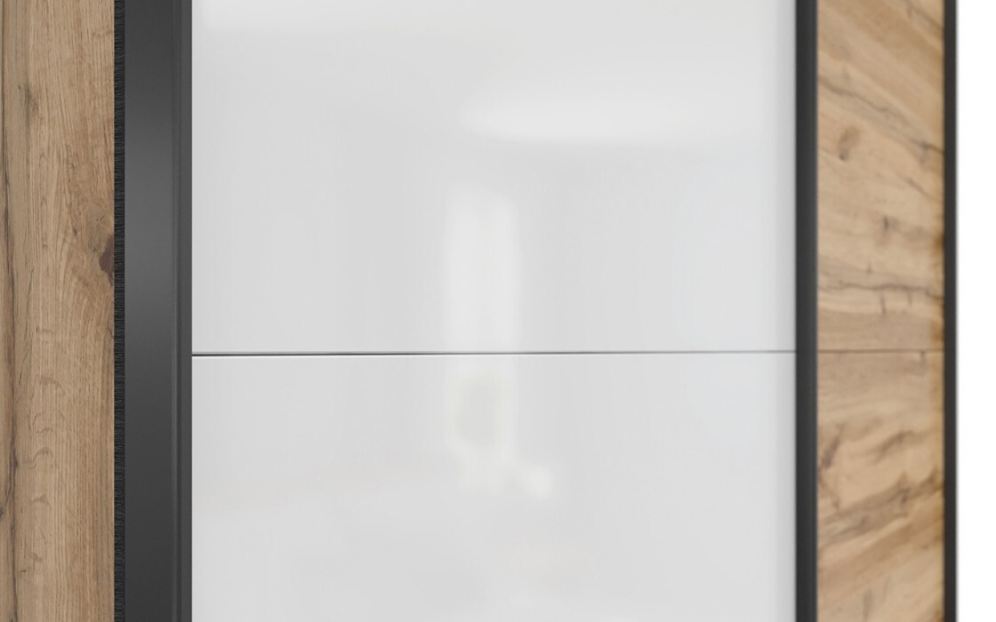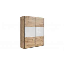 Šatní skříň SZF/153 ze systému TETRIX - kombinovaná s posuvnými dveřmi, vnitřní prostor ve skříni je rozdělen pomocí polic a dvou šatních tyčí, vyrábí se z kvalitního lamina v barevném provedení dub votan/ bílá.