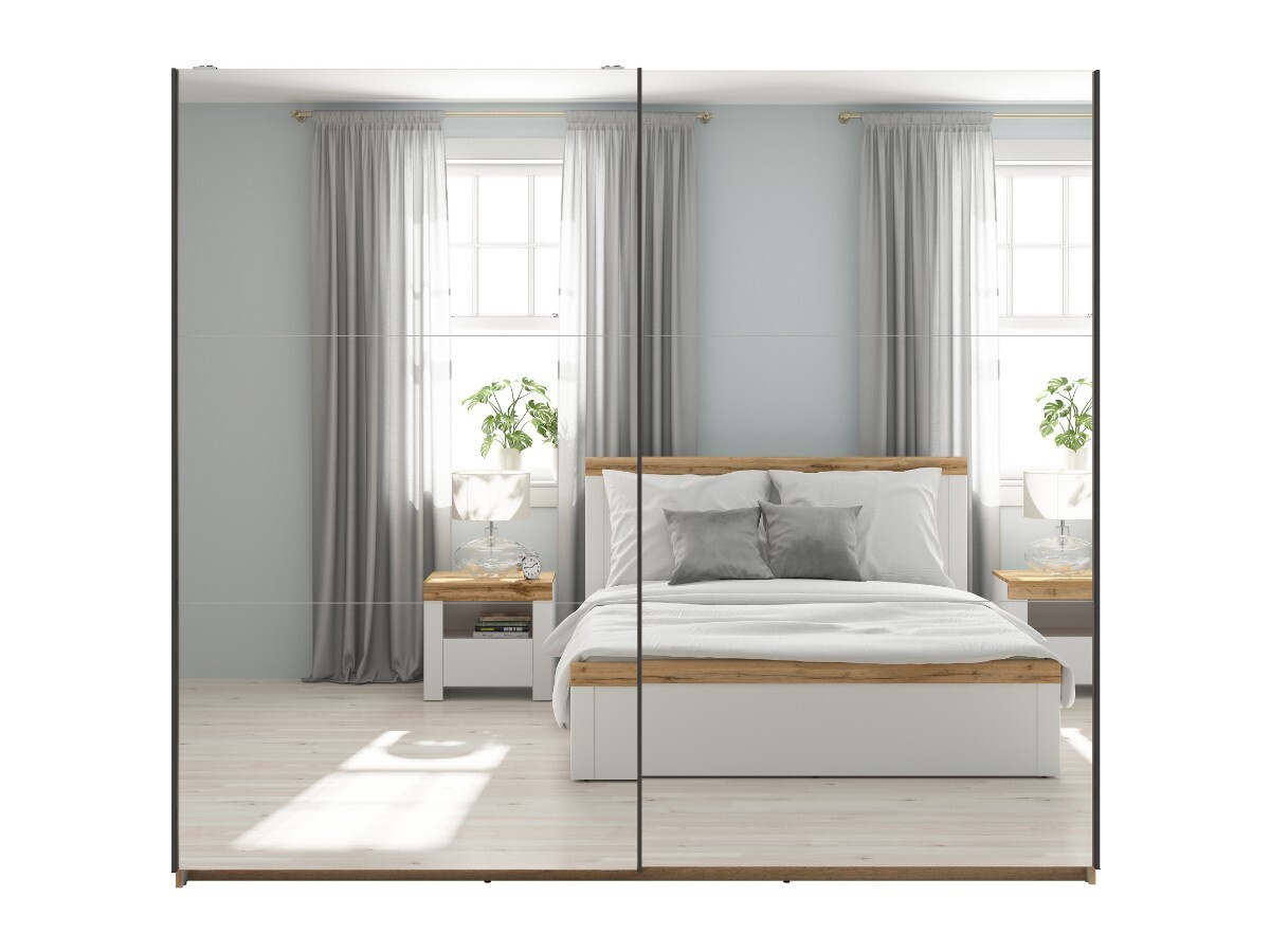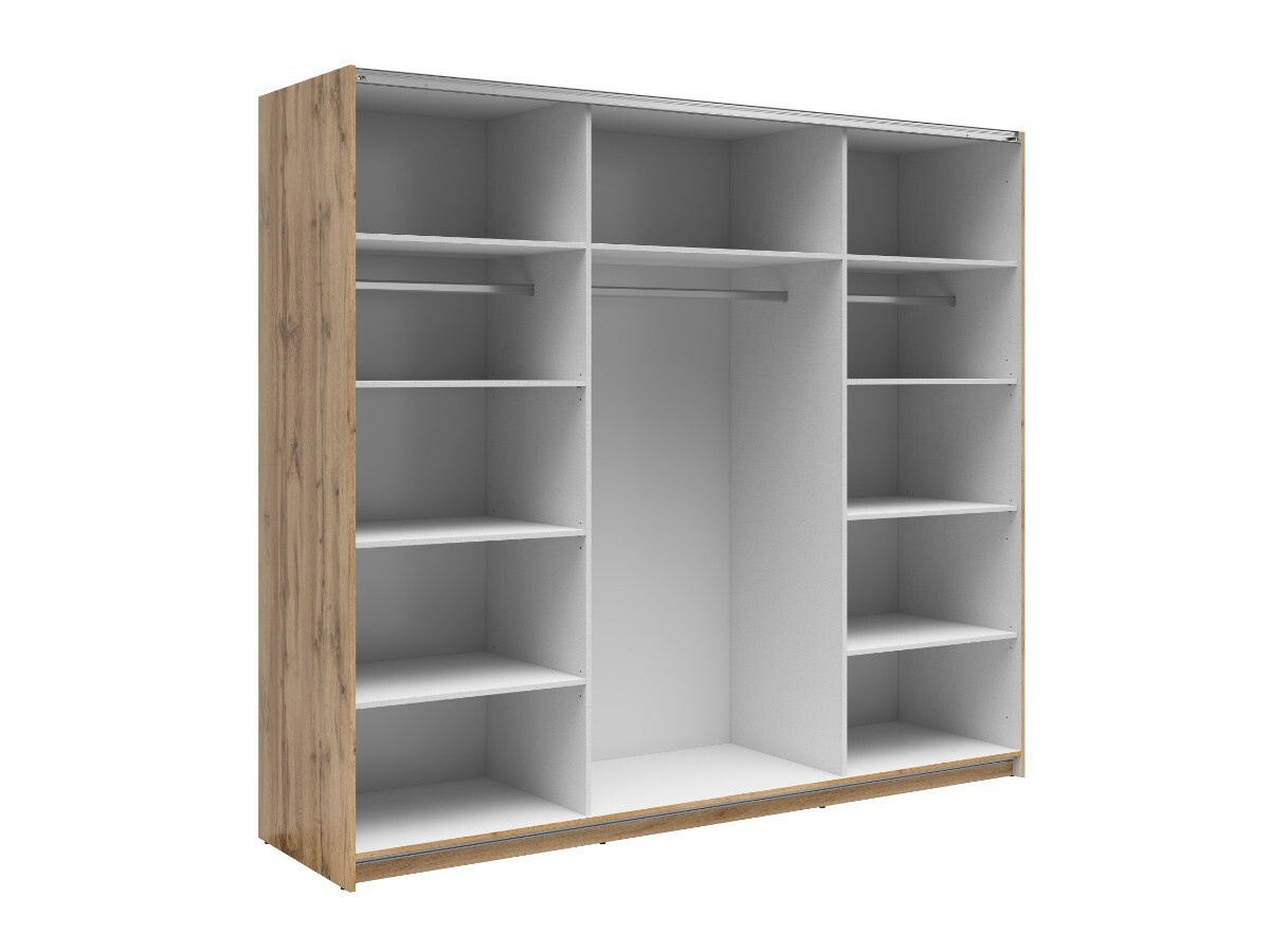 Šatní skříň SZF/220/2M ze systému TETRIX - kombinovaná s posuvnými dveřmi a se zrcadly, vnitřní prostor ve skříni je rozdělen pomocí polic a tří šatních tyčí, vyrábí se z kvalitního lamina v barevném provedení dub votan.