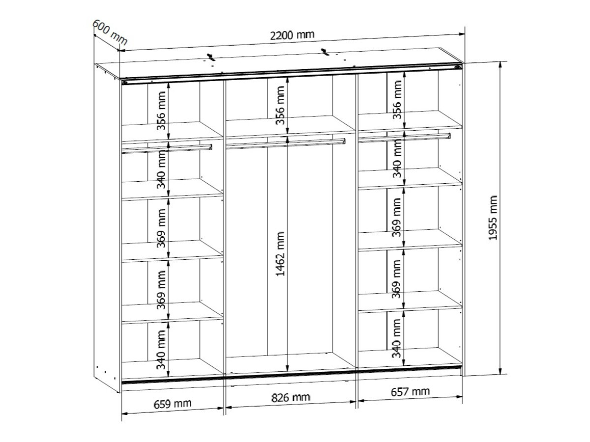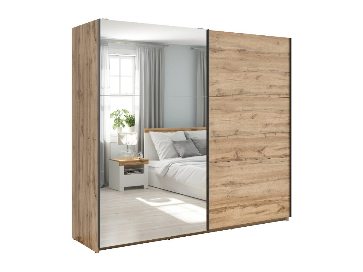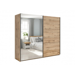 Šatní skříň SZF/220/M ze systému TETRIX - kombinovaná s posuvnými dveřmi a se zrcadlem, vnitřní prostor ve skříni je rozdělen pomocí polic a tří šatních tyčí, vyrábí se z kvalitního lamina v barevném provedení dub votan.