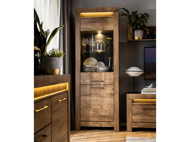 Zajímavá elegance s originálním designem v příjemné barvě dřeva dub ribbeck – to je kolekce TORIN. Jedinečný design nábytku dodává okrasná lišta. Jednotlivé složky kolekce TORIN jsou opatřené tichým dovíráním dvířek, což zpříjemňuje jejich používání. Součástí jsou kovové úchytky a LED osvětlení v dekorační rýhované liště.