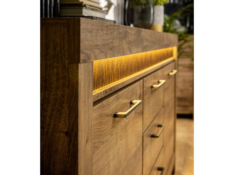 Zajímavá elegance s originálním designem v příjemné barvě dřeva dub ribbeck – to je kolekce TORIN. Jedinečný design nábytku dodává okrasná lišta. Jednotlivé složky kolekce TORIN jsou opatřené tichým dovíráním dvířek, což zpříjemňuje jejich používání. Součástí jsou kovové úchytky a LED osvětlení v dekorační rýhované liště.