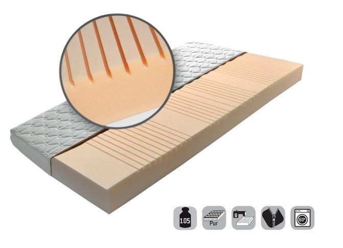 | Matrace ALENA - pěnová matrace z elastické PUR pěny. Speciálně strukturovaným povrchem jádra zajišťuje dobré přizpůsobení se tělu a optimální proudění vzduchu. To je důležité pro dosažení správného spánkového klimatu. Matrace je vhodná i pro polohovatelné lamelové rošty. Výška matrace v potahu je cca 14 cm. Kvalitní postel od ČESKÉHO VÝROBCE za AKČNÍ CENU |