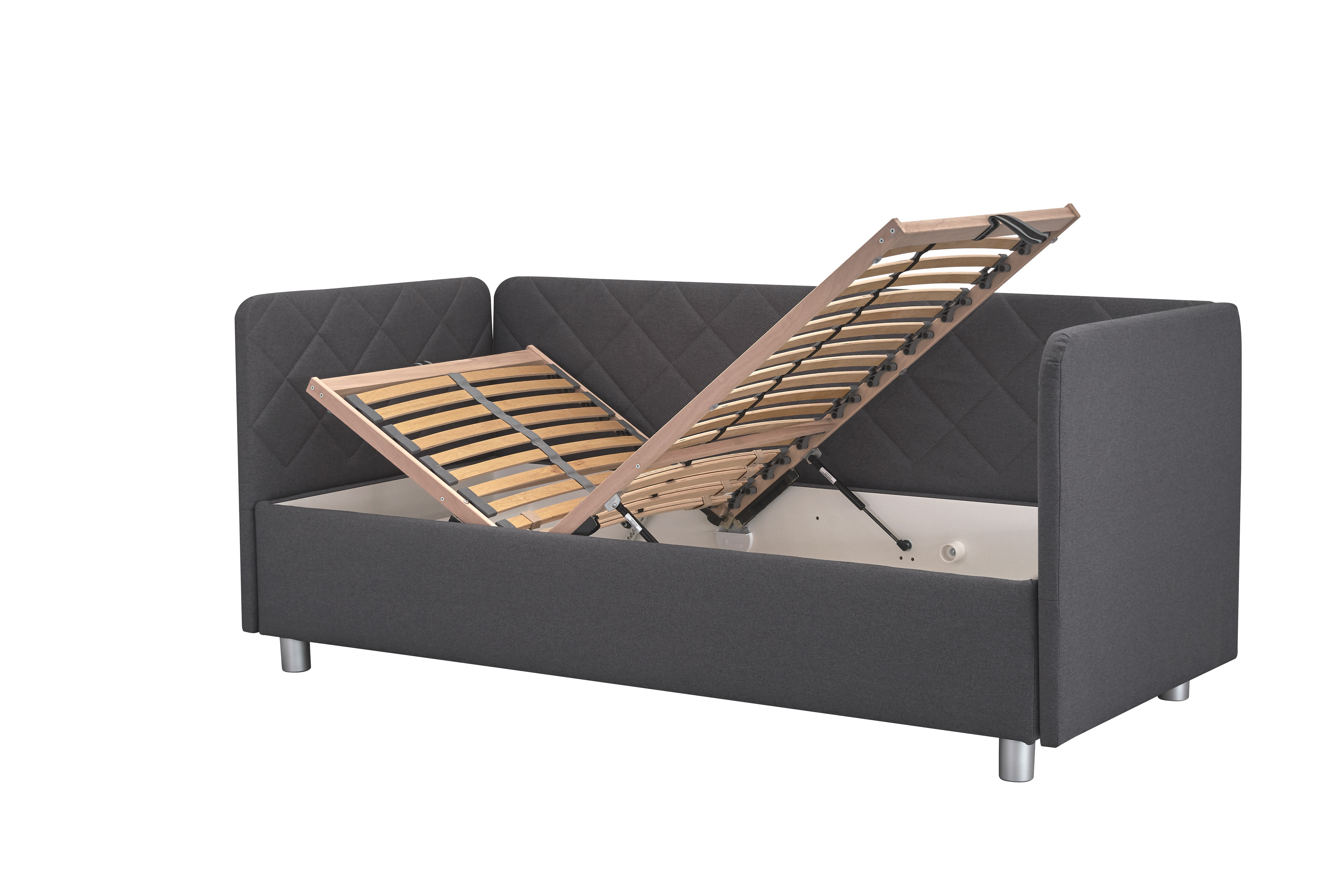 | Kvalitní postel FIONA s polohovacím lamelovým roštem ( 7 poloh pro polohování hlavy + 1 poloha polohování nohou), 28 lamel, nastavení tuhosti a s popruhem proti přetížení). Úložný prostor přístupný od nohou pomocí plynových pístů. Postel je dodávána v těchto potahových látkách - Malmo 83, Malmo 95. Výška lehací plochy: cca 53 cm ( dle zvolené matrace ) K válendě FIONA lze dokoupit krátké i dlouhé čelo. Čela jsou jednostranně čalouněné. Za příplatek možno doobjednat oboustranně čalouněná čela. Matrace NELLY z kvalitních pěn vyrobena bez použití lepidel. Jádro je složeno z desek z polyuretanových pěn o nižší [žlutá pěna] a vyšší [růžová pěna] tuhosti, což umožňuje výběr měkčí a tvrdší strany matrace. Výška matrace v potahu je cca 15 cm. Matrace je opatřena snímatelným potahem. Doporučená nosnost do 110kg.