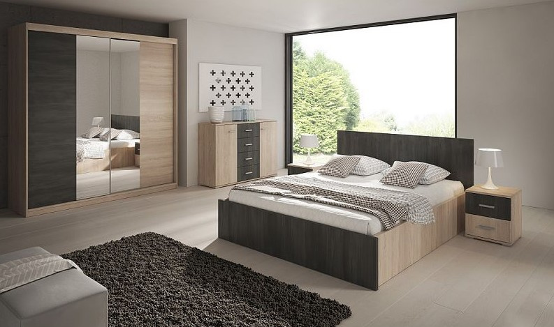Ložnicový systém VERMUT se vyrábí z kvalitního lamina v barevném provedení dub sonoma/černá borovice norská. Toto barevné provedení je jistotou pro moderní, nadčasovou ložnici. Ložnicový nábytek VERMUT zaujme jednoduchým designem a vysokou kvalitou. Nabízí šatní skříň, postel, komody a noční stolek.