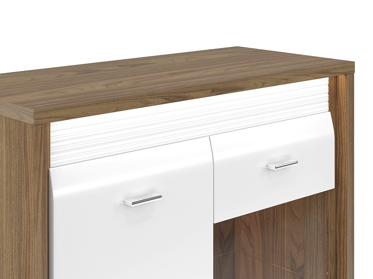 Luxusní systémový nábytek Dallas má pečlivě vybraný dekor přírodního ořechu s čelními plochami v bílém lesku, které přinášejí eleganci a svěžest do Vašeho bytu. Nábytkový systém Dallas je charakteristický horním zaoblením dvířek v MDF folii, které svým tvarem zdůrazňují jeho jedinečnost. Dalším atraktivním detailem je rýhovaná lišta horní lišta, která si můžete vybrat ve dvou odstínech - bílá nebo ořech, která je u komod a televizních stolků, s LED nasvícením. Celkový exkluzivní dojem je doplněn kovovými úchyty. Volbou nábytku DALLAS dodáte Svému interiéru eleganci a exkluzivitu.