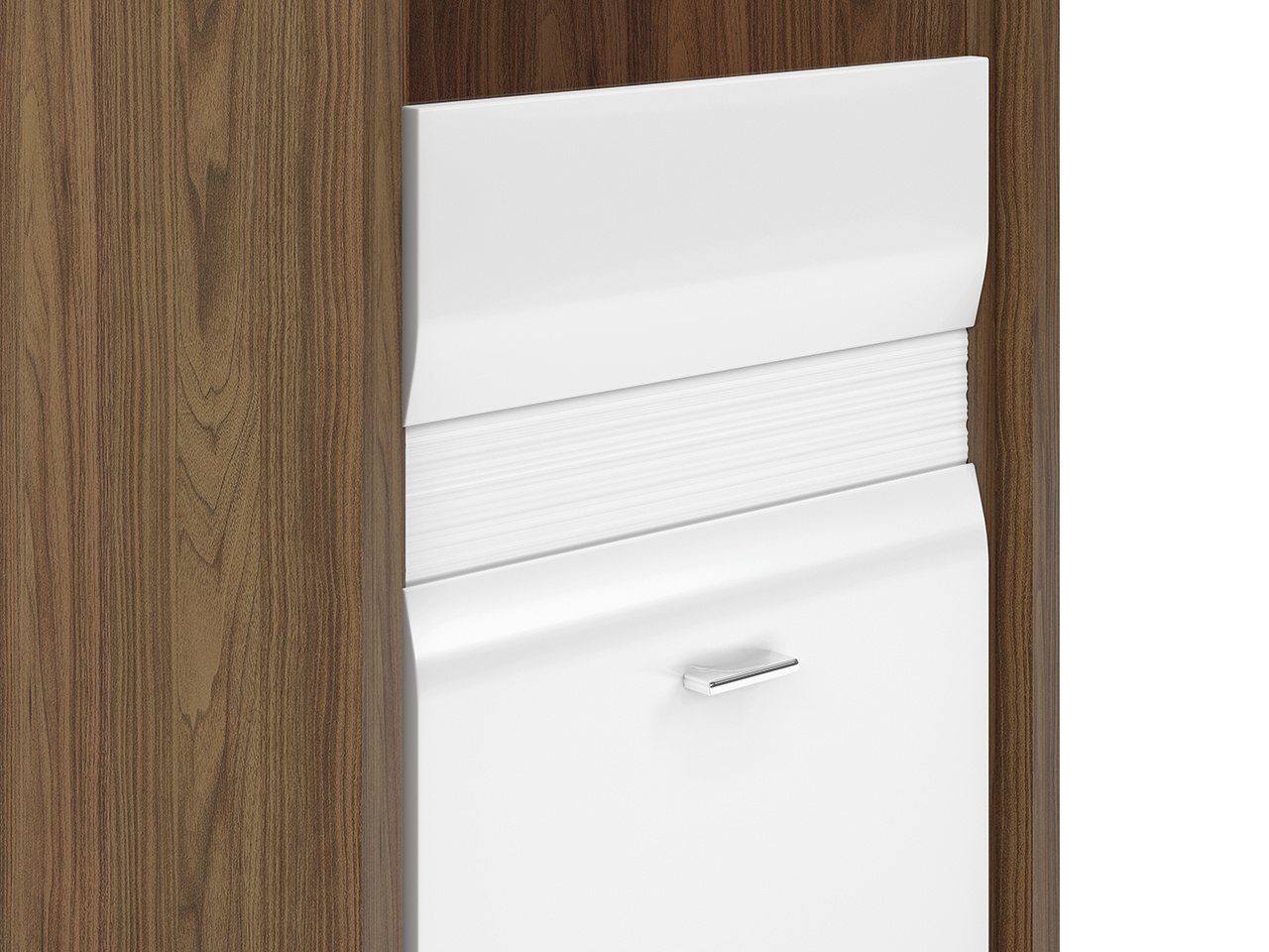 Luxusní systémový nábytek Dallas má pečlivě vybraný dekor přírodního ořechu s čelními plochami v bílém lesku, které přinášejí eleganci a svěžest do Vašeho bytu. Nábytkový systém Dallas je charakteristický horním zaoblením dvířek v MDF folii, které svým tvarem zdůrazňují jeho jedinečnost. Dalším atraktivním detailem je rýhovaná lišta horní lišta, která si můžete vybrat ve dvou odstínech - bílá nebo ořech, která je u komod a televizních stolků, s LED nasvícením. Celkový exkluzivní dojem je doplněn kovovými úchyty. Volbou nábytku DALLAS dodáte Svému interiéru eleganci a exkluzivitu.