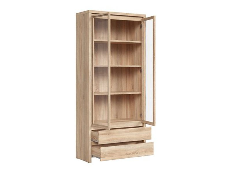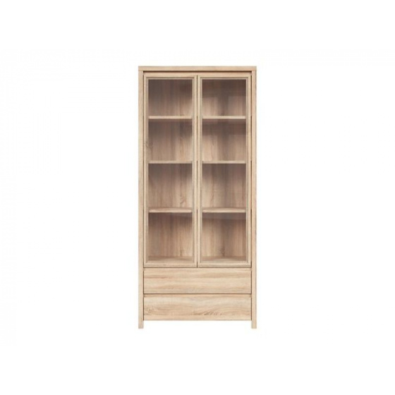 Vitrína REG2W2S systém KASPIAN, dvoudveřová, prosklená s policemi a dvěma šuplíky ve spodní části, tvarovaná přední hrana dvířek a čela zásuvky umožňuje bezúchytkové otvírání