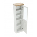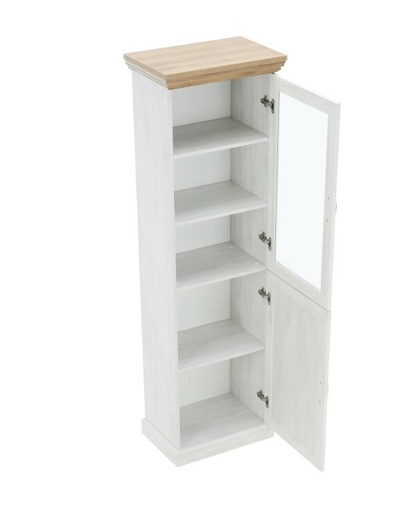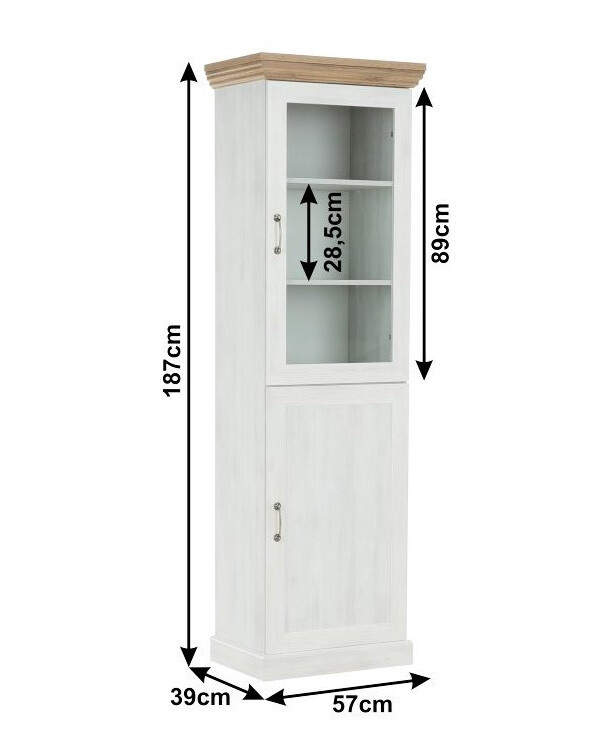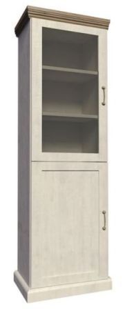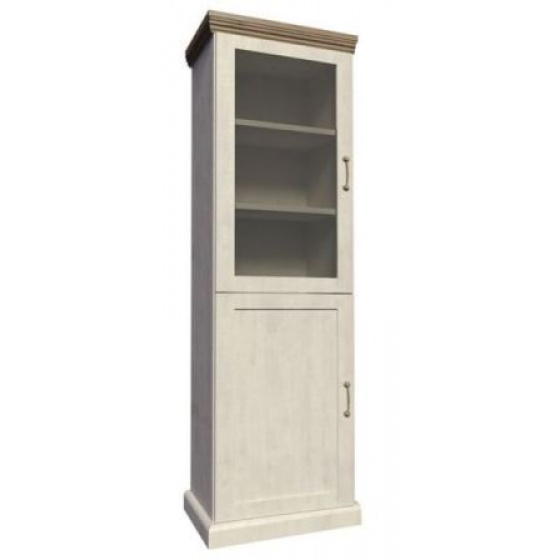 Vitrína W1D je policová, spodní dvířka jsou plná, horní dvířka jsou prosklená