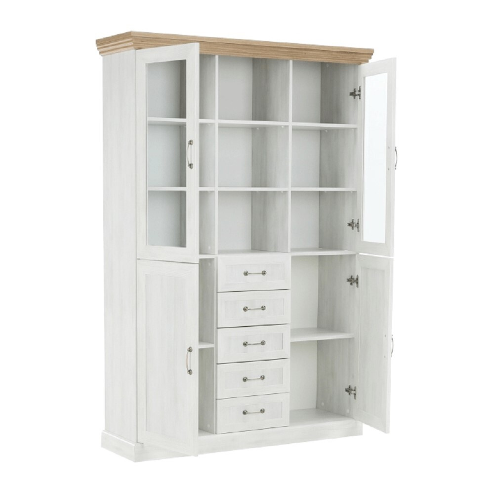 Vitrína W2D má v dolní části šuplíky a po stranách plná dvířka. V horní části jsou police po stranách uzavřeny prosklenými dvířky.