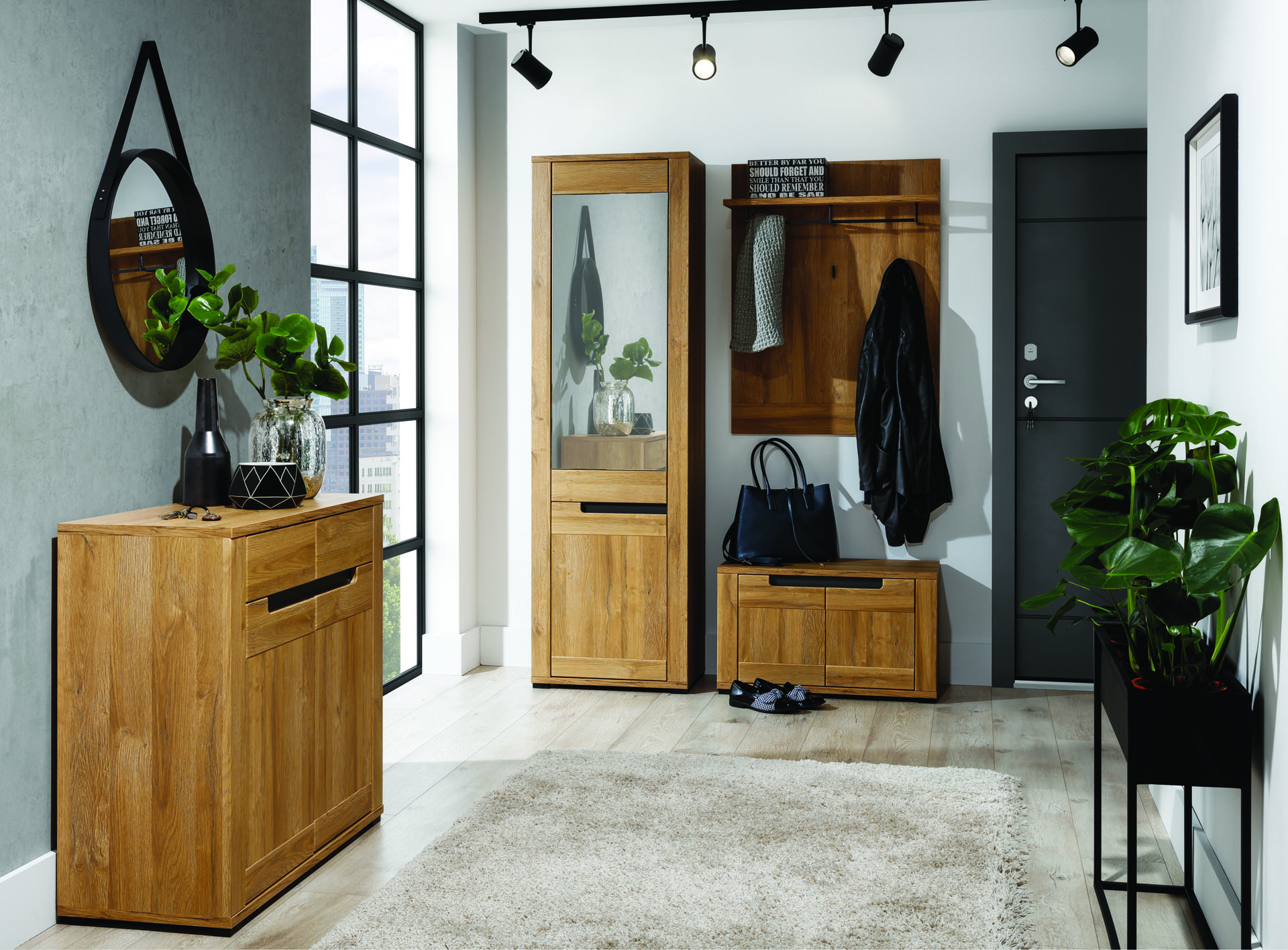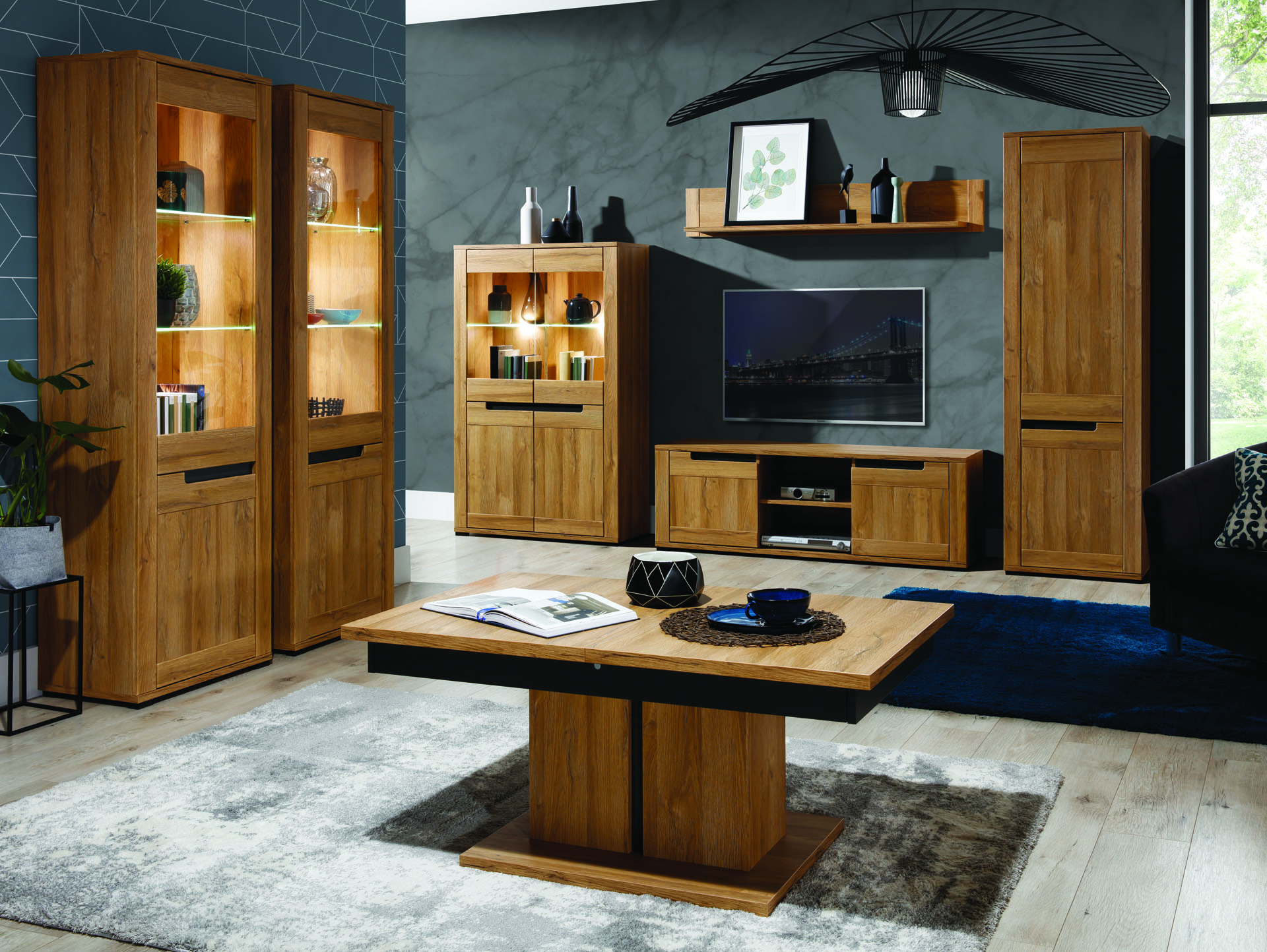 Moderní systémový nábytek YORK se vyrábí z kvalitního lamina v dezénu dub grandson. Světlý dekor dřeva v kombinaci s doplňky v barvě grafitu působí elegantním dojmem. V nabídce máte 23 jednotlivých dílů, ze kterých můžete zařídit obývací pokoj, jídelnu, předsíň i ložnici. Korpusy sektoru YORK mají sílu lamina 16 mm, vrchní desky 22 mm a hrany chrání ABS 0,5 mm. Dvířka, se systémem tichého dovírání a šuplíky s kuličkovými pojezdy s plným vysunutím, jsou z MDF potažené PVC folií. Zajímavým detailem je bezúchykové otevíráni. Nožičky jsou plastové, čelní skla jsou tvrzená. LED podsvícení skleněných polic si můžete doobjednat.