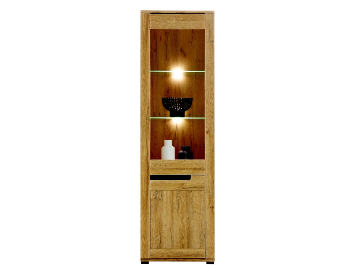 Moderní systémový nábytek YORK se vyrábí z kvalitního lamina v dezénu dub grandson. Světlý dekor dřeva v kombinaci s doplňky v barvě grafitu působí elegantním dojmem. V nabídce máte 23 jednotlivých dílů, ze kterých můžete zařídit obývací pokoj, jídelnu, předsíň i ložnici. Korpusy sektoru YORK mají sílu lamina 16 mm, vrchní desky 22 mm a hrany chrání ABS 0,5 mm. Dvířka, se systémem tichého dovírání a šuplíky s kuličkovými pojezdy s plným vysunutím, jsou z MDF potažené PVC folií. Zajímavým detailem je bezúchykové otevíráni. Nožičky jsou plastové, čelní skla jsou tvrzená. LED podsvícení skleněných polic si můžete doobjednat.