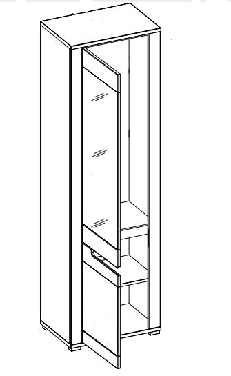Šatní skříň se zrcadlem Y11 levá ze systému YORK - dvou dvířková ( s dvířky nad sebou ) se zrcadlem na horních dveřích, s policemi dole a vysouvací šatní tyčí nahoře. Skříň je díky své menší hloubce vhodná do předsíně.